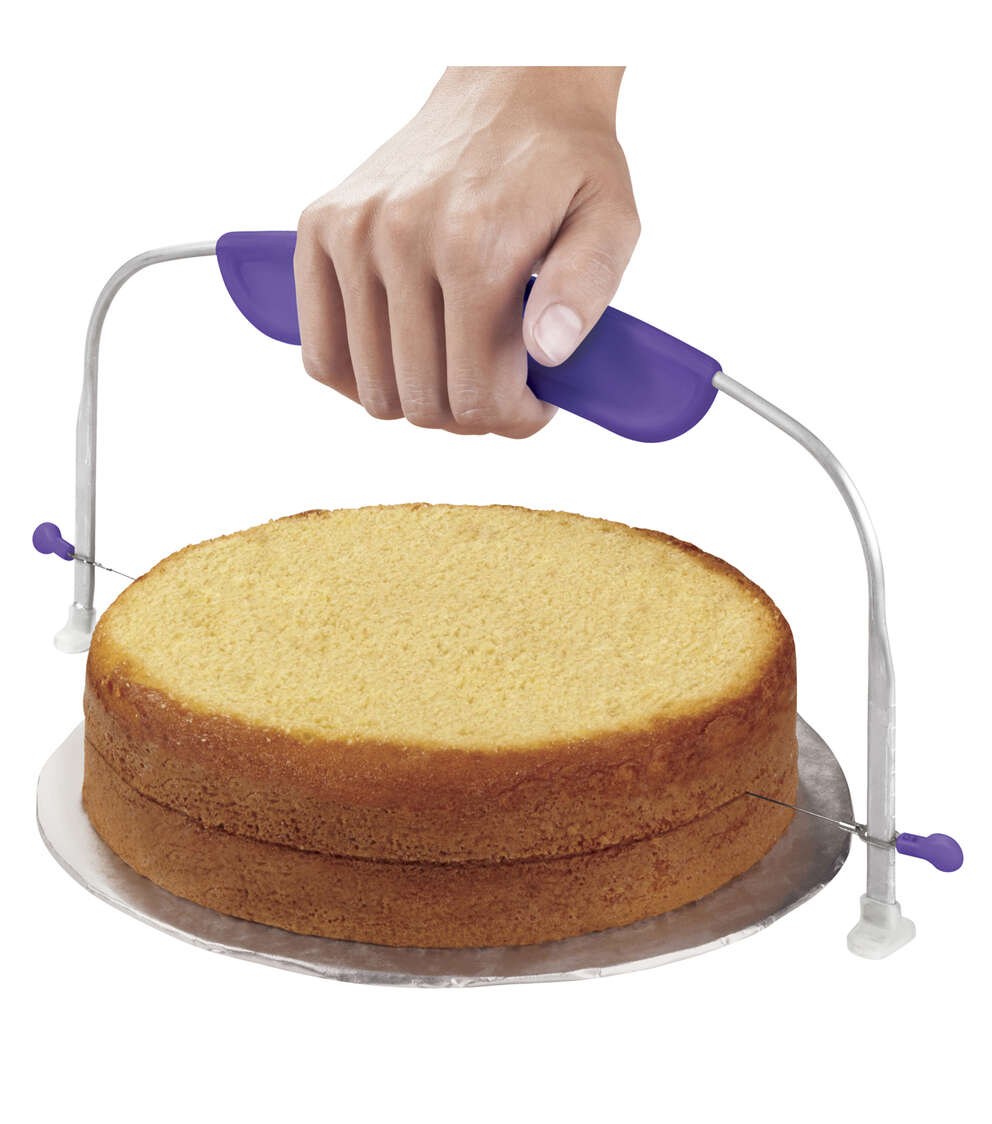 Torting and leveling cakes up to 10 inches is easy with this handy tool. Clearly defined height markers help with accuracy and the wavy wire cuts cleanly while reducing crumbs. Flat; hard; plastic feet provide stability but also allow it to slide easily across the countertop. Each package contains one cake leveler.