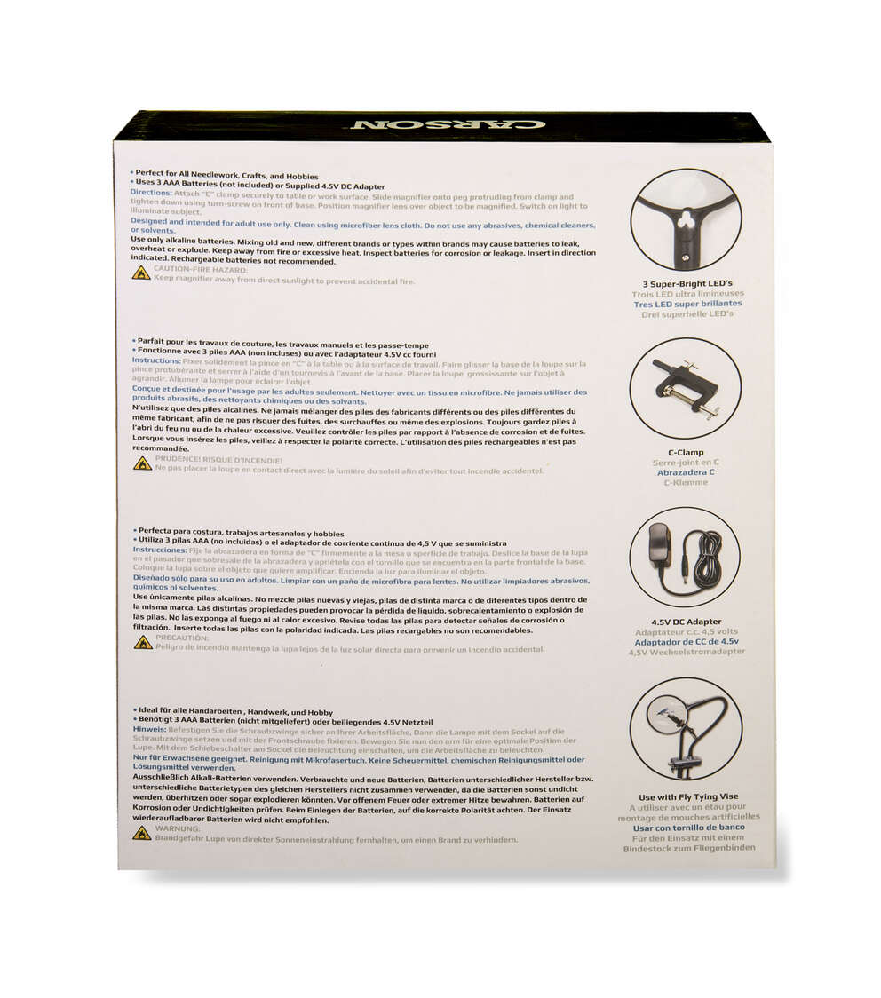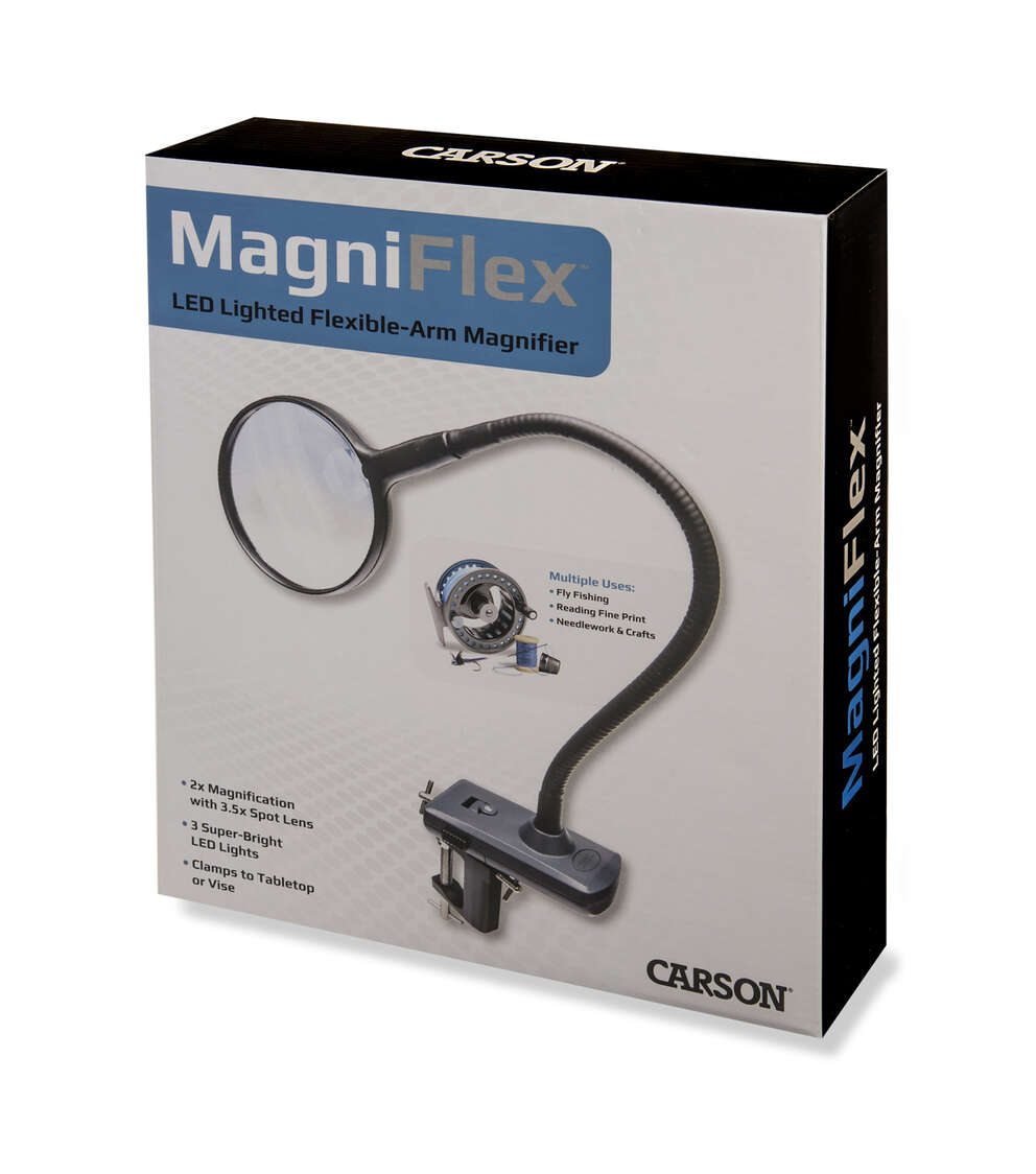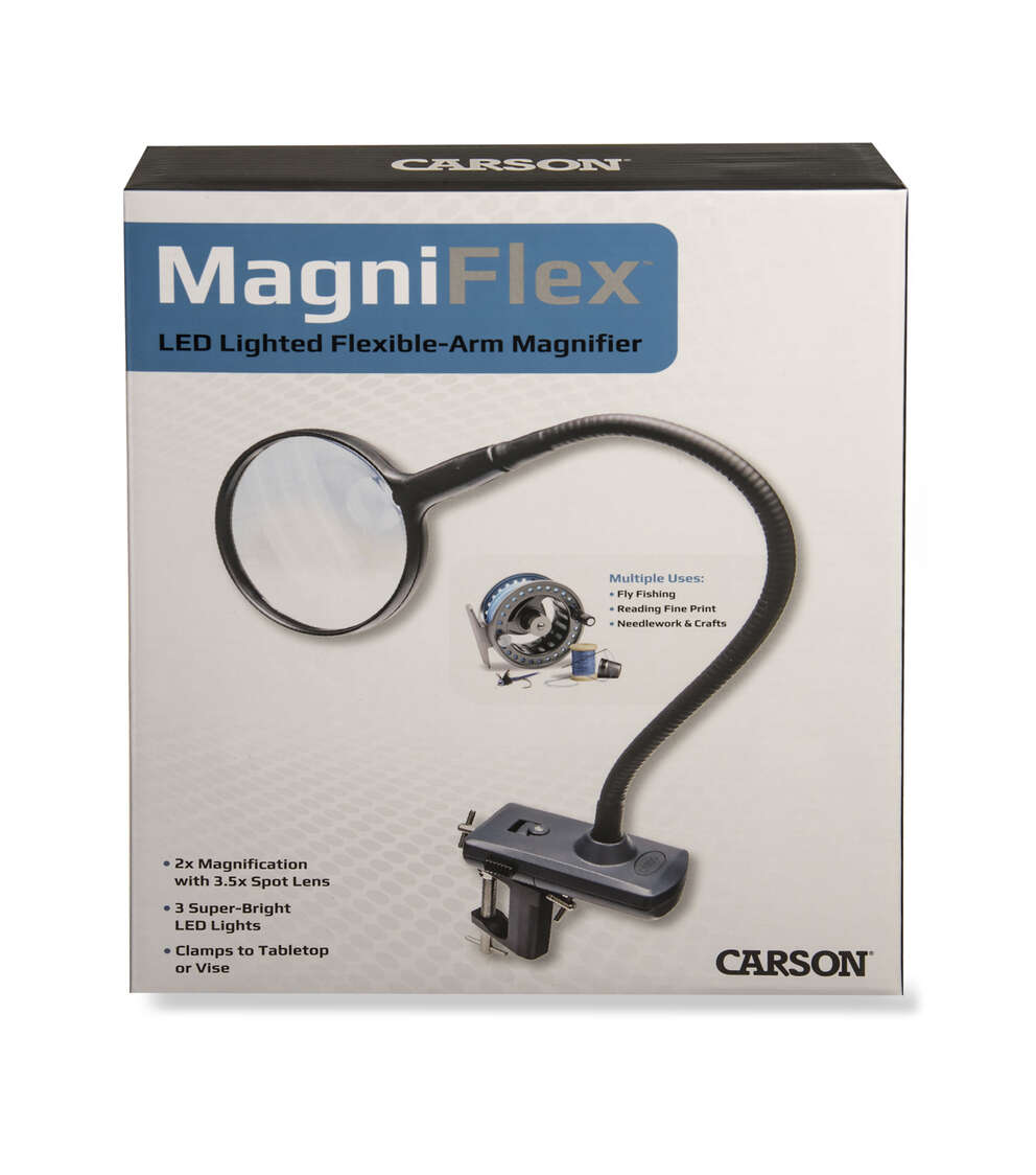 The MagniFlex (CL-65) from CARSON is an LED lighted, fully-adjustable, flexible arm hands-free magnifying glass that attaches to your tabletop for convenient hands-free use. Its large 2x power lens gives you a sharp, distortion-free view, and 3.5x power spot lens allows you to see even the finest details with ease. Three super bright LED lights allow for use in low-light conditions. This magnifier operates on 3 AAA batteries (not included) or the supplied 4.5v DC adapter. The MagniFlex can be used for a variety of purposes ranging from hobbies, crafts, sewing, needlepoint, crochet, cross-stitch, model building, soldering, jewelry making, reading, inspection of coins and stamps and other tasks. It is a great addition to add to your garage or work space. At Carson, we are so confident in our magnifiers that we back them with a Lifetime Limited Warranty!