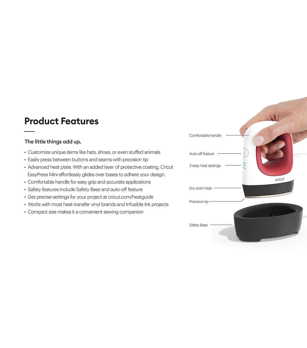 Bring on the ususual objects and improbable projects. Now you can get professional heat-transfer results with Cricut EasyPress Mini! Whether it's a shapely object or an extra-small and unique project, including baby shoes, hats, stuffed animals, and more, you'll have what it takes to make a successful heat transfer. The design is compact and thoughtful, so you can easily curve with contours, get between buttons, and even squeeze into seams. Three heat settings are all you need for every heat-transfer project, including Infusible Ink transfers when used on a compatible blank. An insulated base and an auto-shutoff feature are safety features you'll love. Plus it's lightweight, portable, and easy to store. Works with major brands of HTV, iron-on, and the entire Infusible Ink family of products. It's a perfect complement to any Cricut cutting machine.