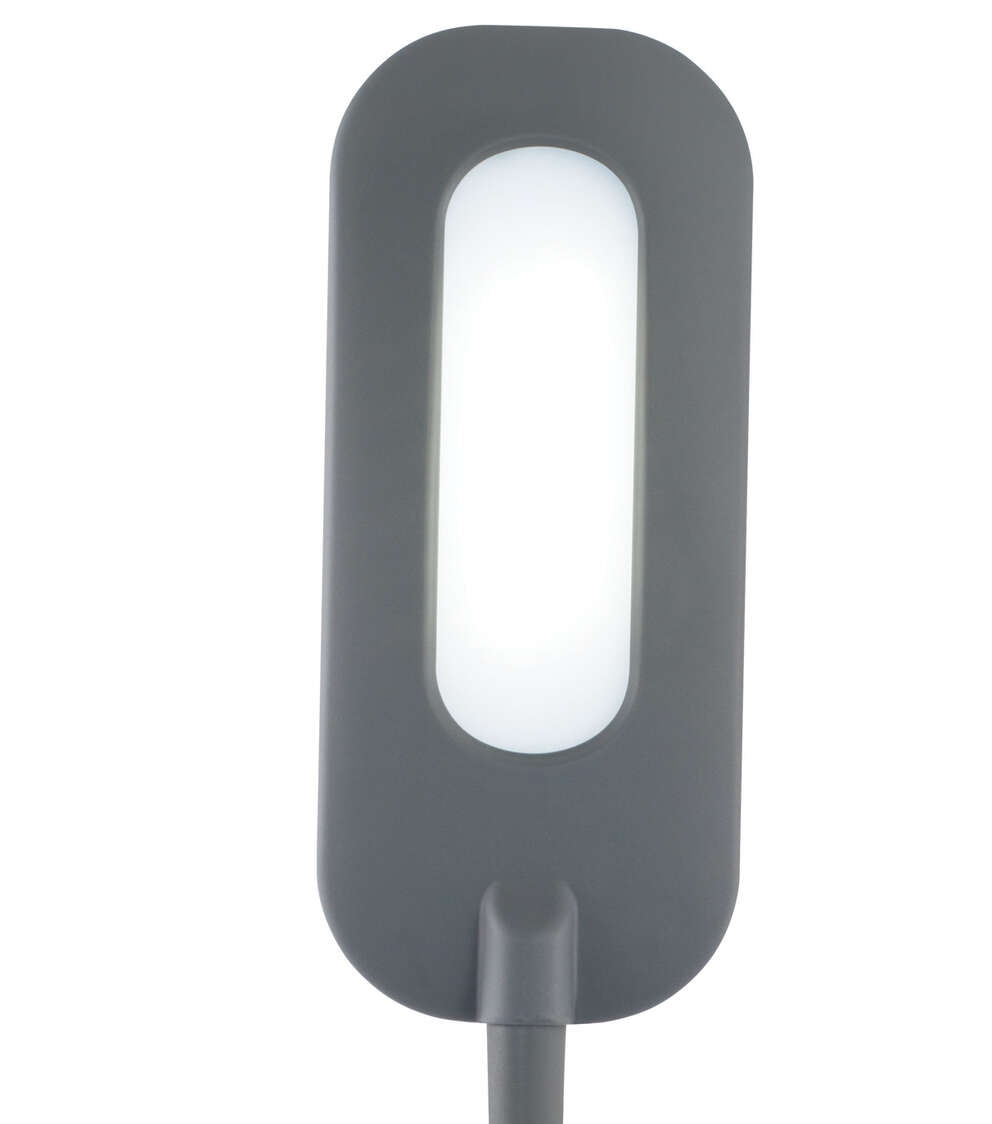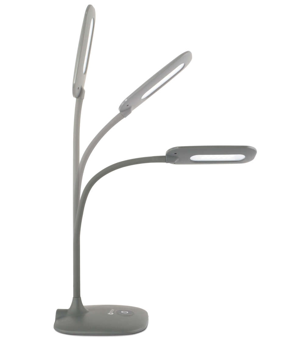 - The grey OttLite Flexible Soft Touch LED Desk Lamp is perfect for your crafting table, desk or dorm room. With a 6.25" shade that extends over your work area and a flexible, rubberized neck, you can direct light wherever you need it most. The 3 brightness setting are touch-activated and the soft touch finish fits any décor. With OttLite Natural Dayight LED Illumination, you can see details clearly and reduce glare & eyestrain so you can do what you love, longer. NOTE: This item is designed only for American 110V/120V (Single Voltage) and may require a power adapter or voltage transformer to work in countries outside of USA & Canada.