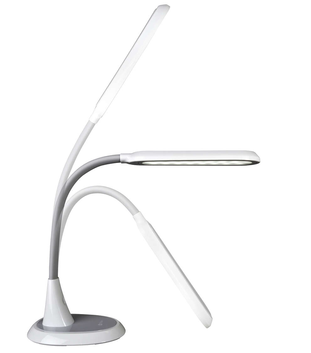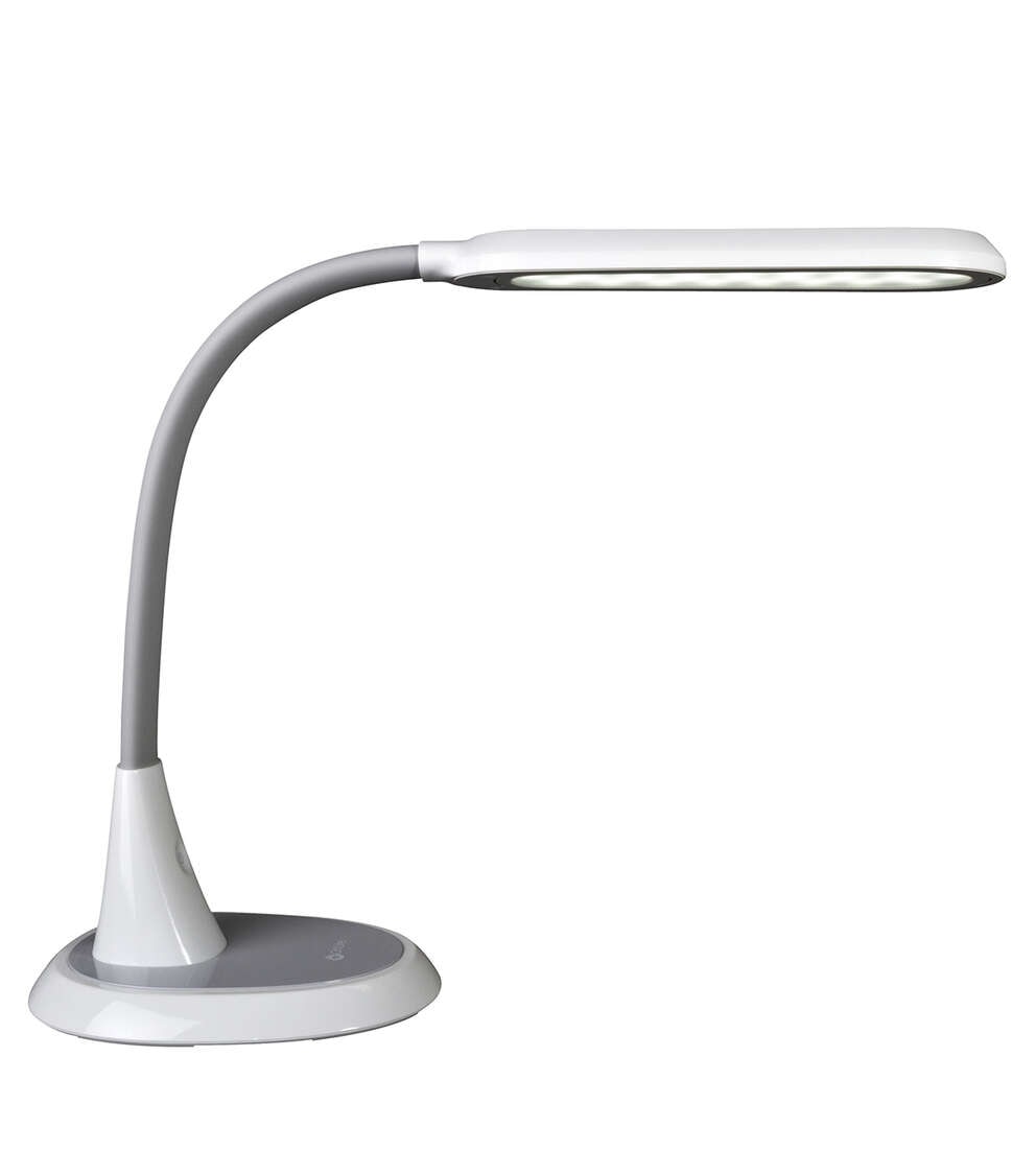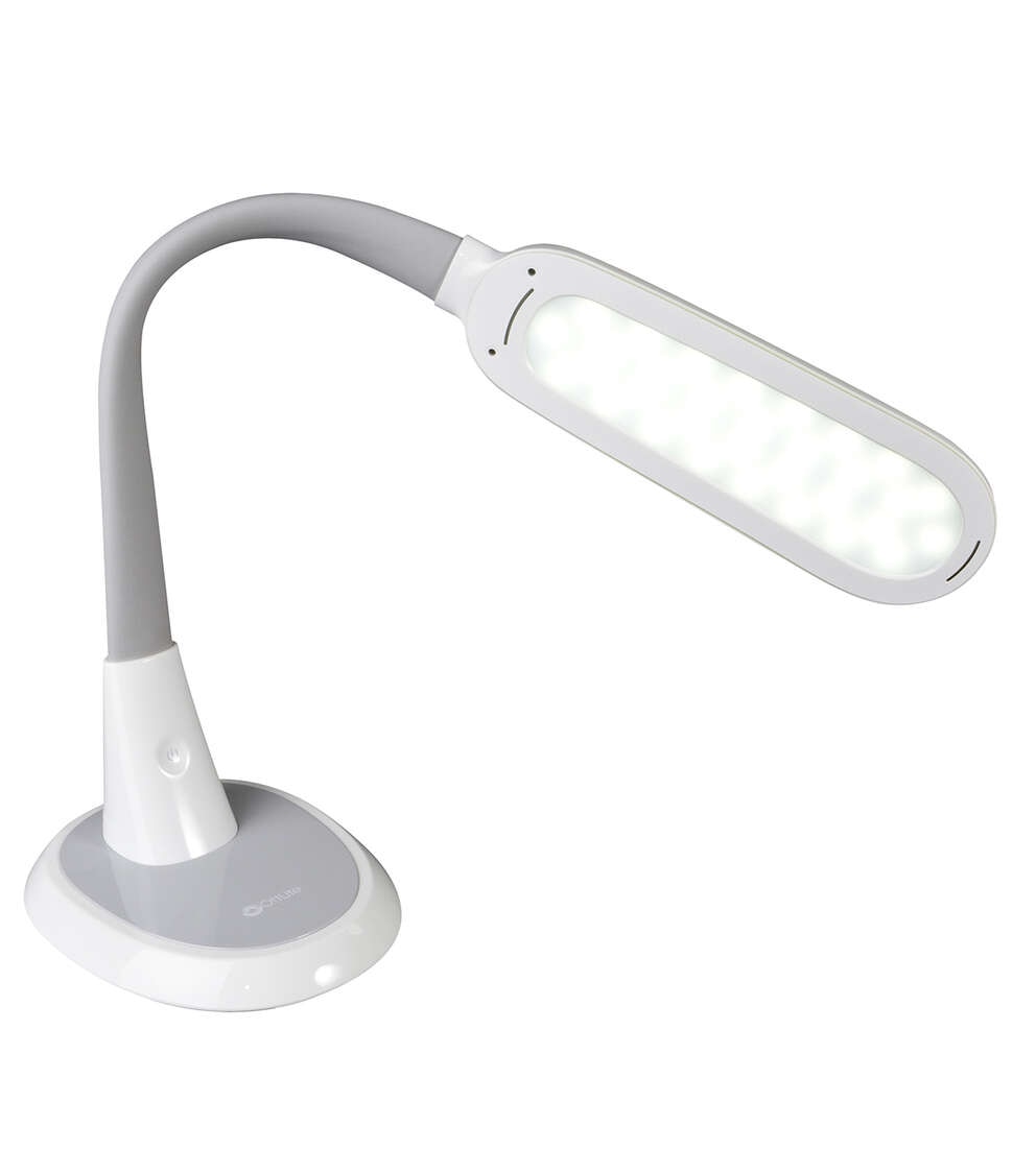 Perfect for large workspaces and big projects, the OttLiteLite Wide Area Dimmable LED Table Lamp delivers expansive ClearSun LED illumination that shows colors true to life and helps reduce eyestrain for hours of visual comfort. The wide shade measures 12 x 4 inches with three brightness levels to deliver just the right amount of OttLiteLite’s ClearSun illumination for your space. Use at full height of 27 inches to cover a large area; or bend the flexible neck down to 12 inches for focused, concentrated light, great for tracing, jewelry making and detail work. OttLiteLite allows you to see details clearly and colors accurately, helping you do what you love, longer.