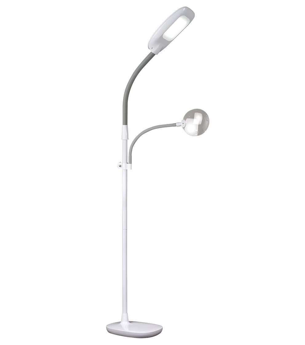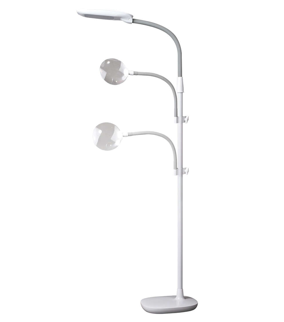 See every color true to life and detail clearly with this OttLite floor lamp featuring eyestrain-reducing ClearSun LEDs and a 1.75x magnifier. Bend and flex as you work with the flexible yet sturdy arm that adjusts the height from 47.5 to 64 inches. With the touch sensitive controls select from three brightness levels to provide just the amount of light you need for your work space. The optical grade magnifier on a flexible arm is rimless for uninterrupted viewing and includes a 3x spot viewer perfect for threading needles and precise detail work. Great for sewing tables, next to your favorite knitting or embroidery spot or a home office.