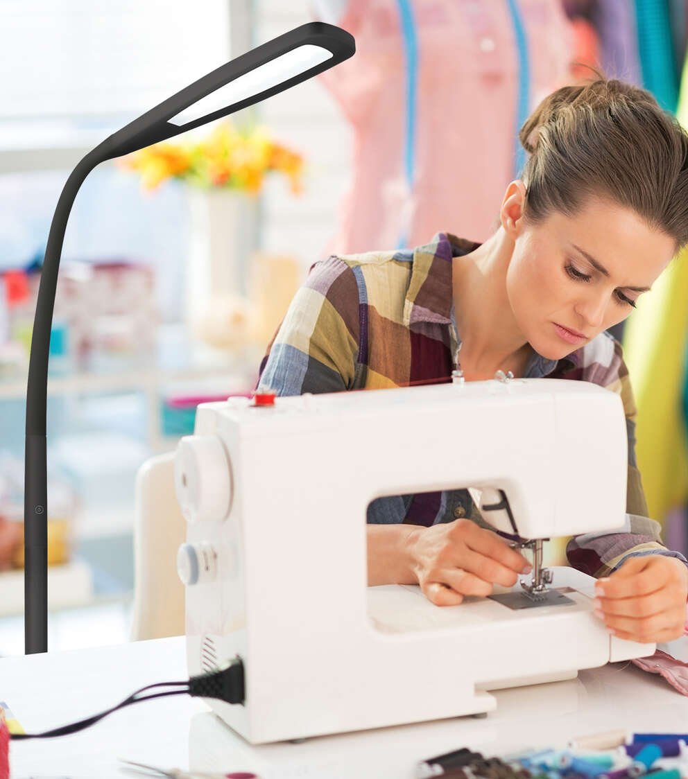 The OttLite Natural Daylight LED Flex Floor Lamp-White helps you see details clearly and colors accurately, whether reading in your favorite chair or sewing in your sewing room. An expansive 12.5-inch shade and rubberized flexible neck allows you to direct the powerful OttLite Natural Daylight LED Illumination right where you need it. Touch-activated controls adjust the brightness levels and the smart memory feature remembers your last brightness setting. With this OttLite lamp you can see details clearly and reduce glare and eyestrain so you can do what you love, longer.