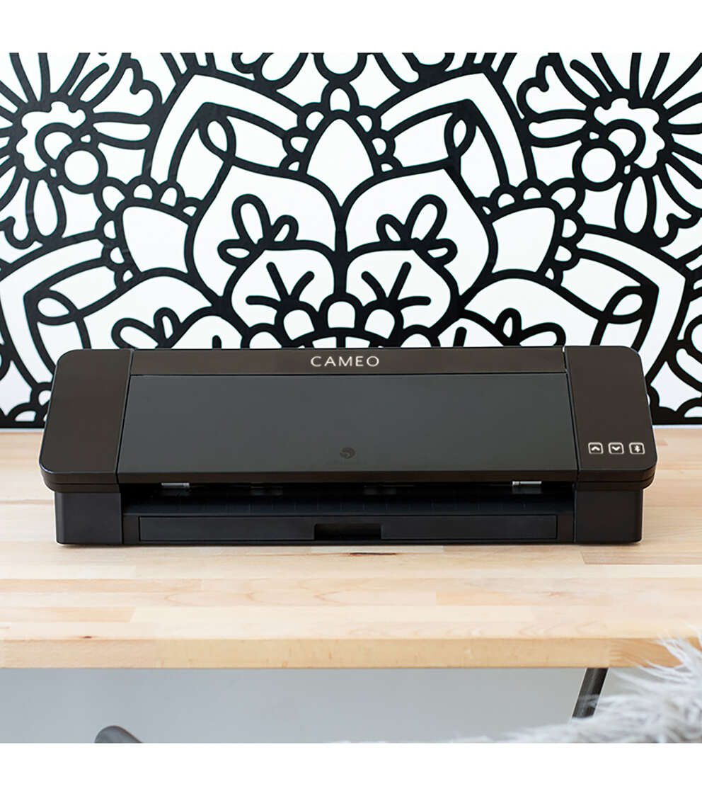 - Included: - Silhouette Cameo 4 - Power cable & USB cable - Cameo Cutting Mat (12 in. x 12 in.) - AutoBlade - Adapters for standard blade, premium blade, deep-cut blade, 2mm Kraft Blade, and Silhouette sketch pens - Silhouette Studio software (download) - 100 exclusive designs (download) - 1-month Silhouette Design Store subscription (available with machine registration)