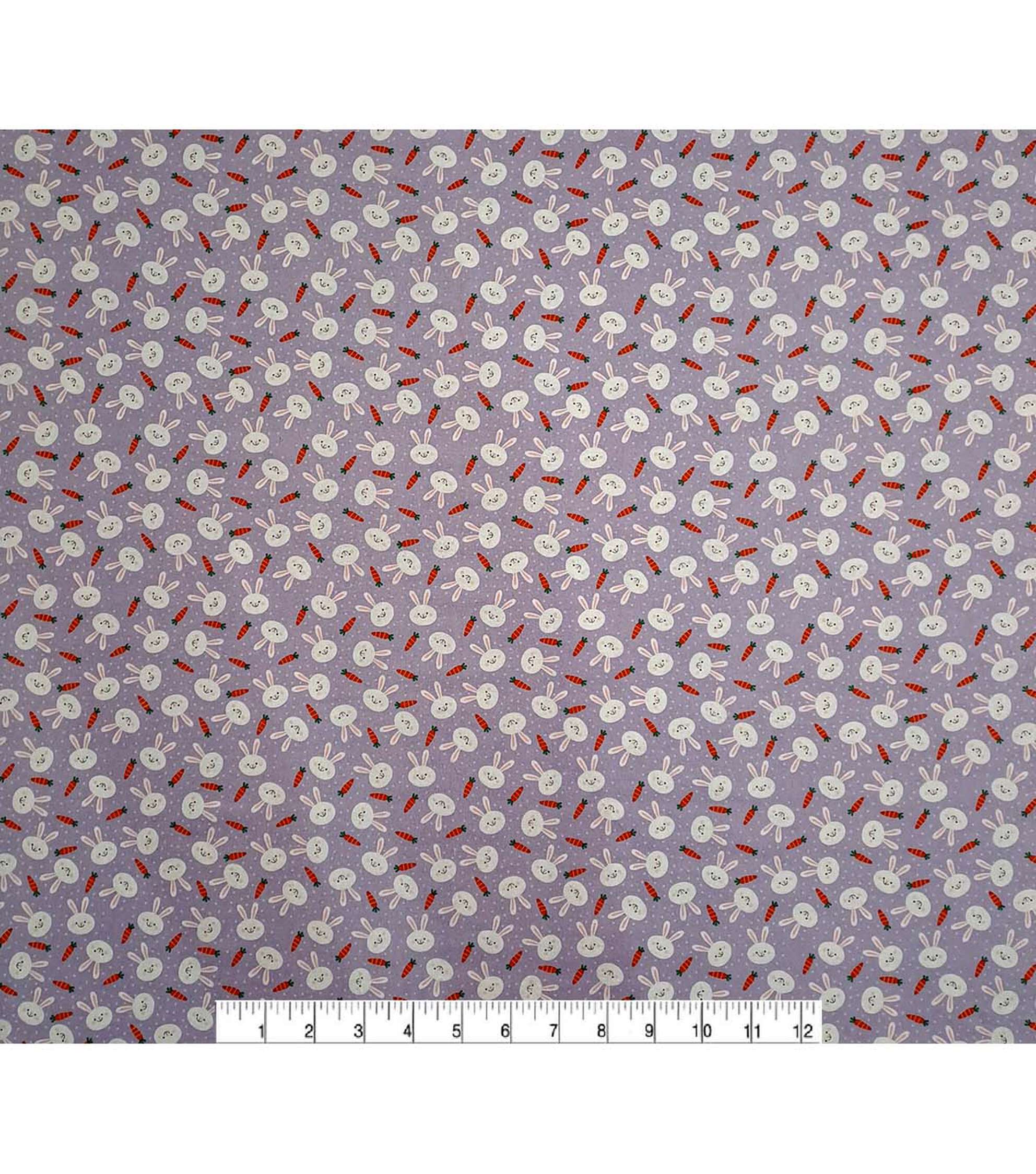 Snuggle up with this adorable flannel fabric featuring bunnies and carrots on a cozy purple background. Perfect for creating warm and comfortable blankets and more. This 100% cotton fabric is easy to care for and will keep you warm all winter long.