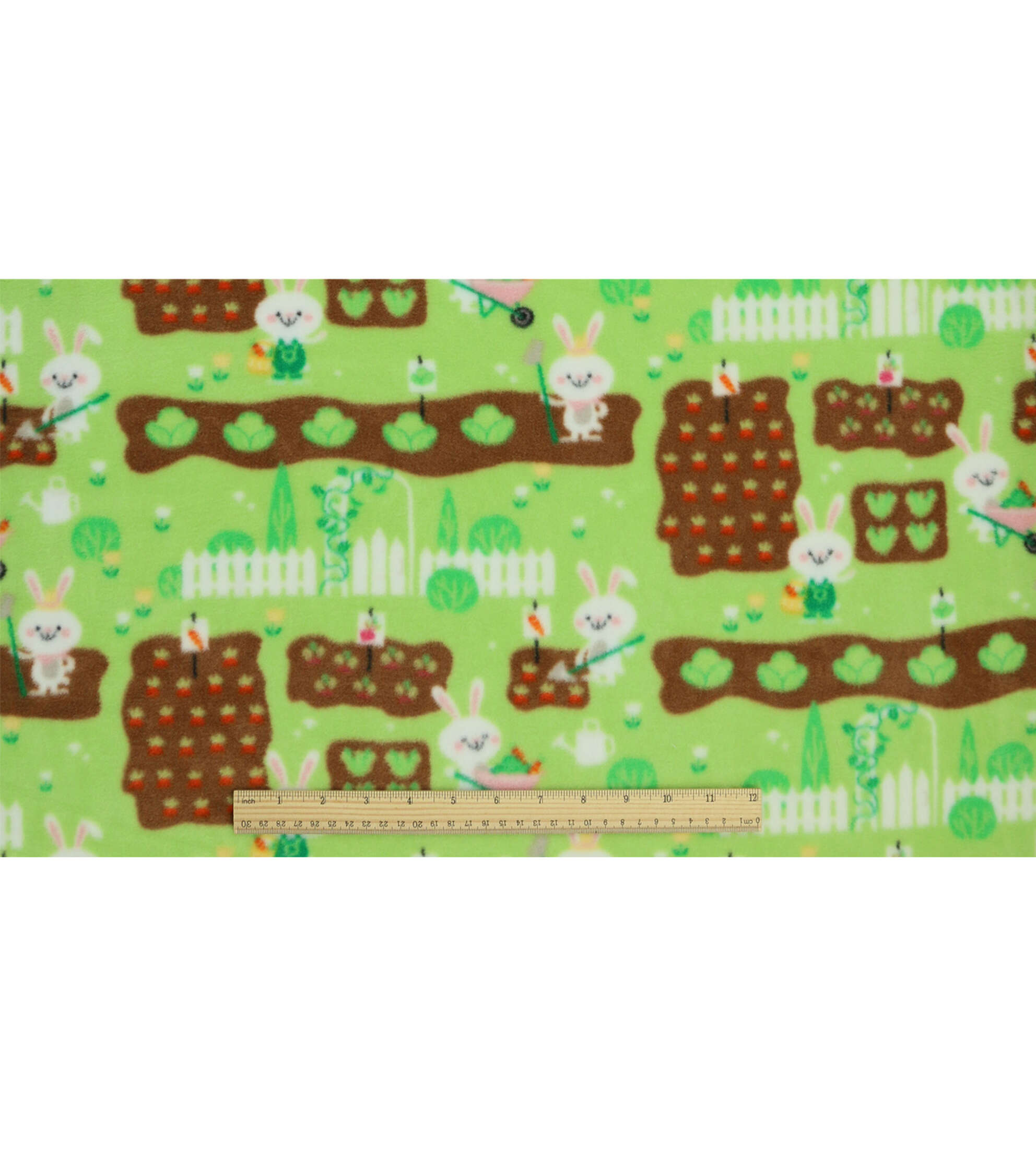 Bunnies Gardening on Green Anti Pill Plush Fleece Fabric by POP!