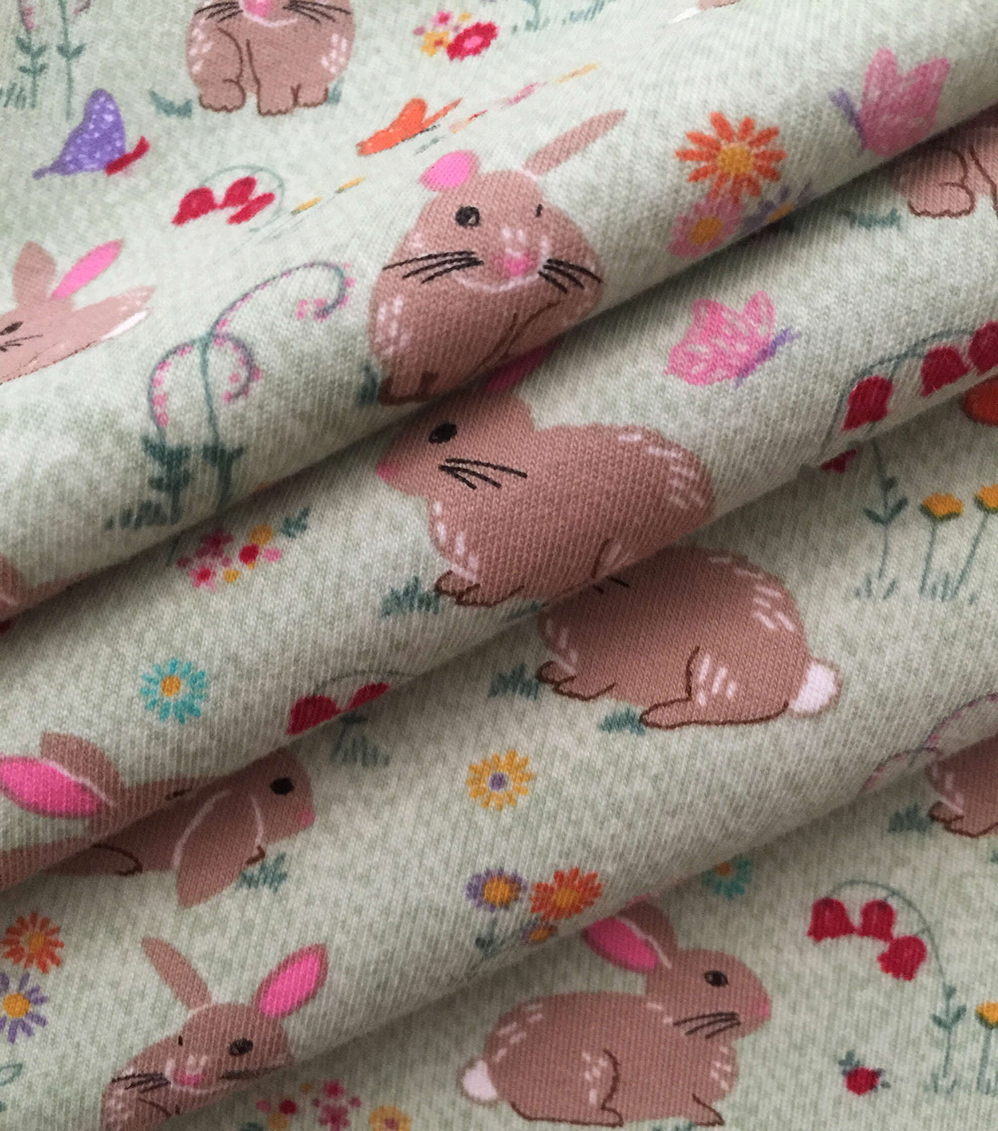 • Bunnies on Green Interlock Knit Fabric by POP!