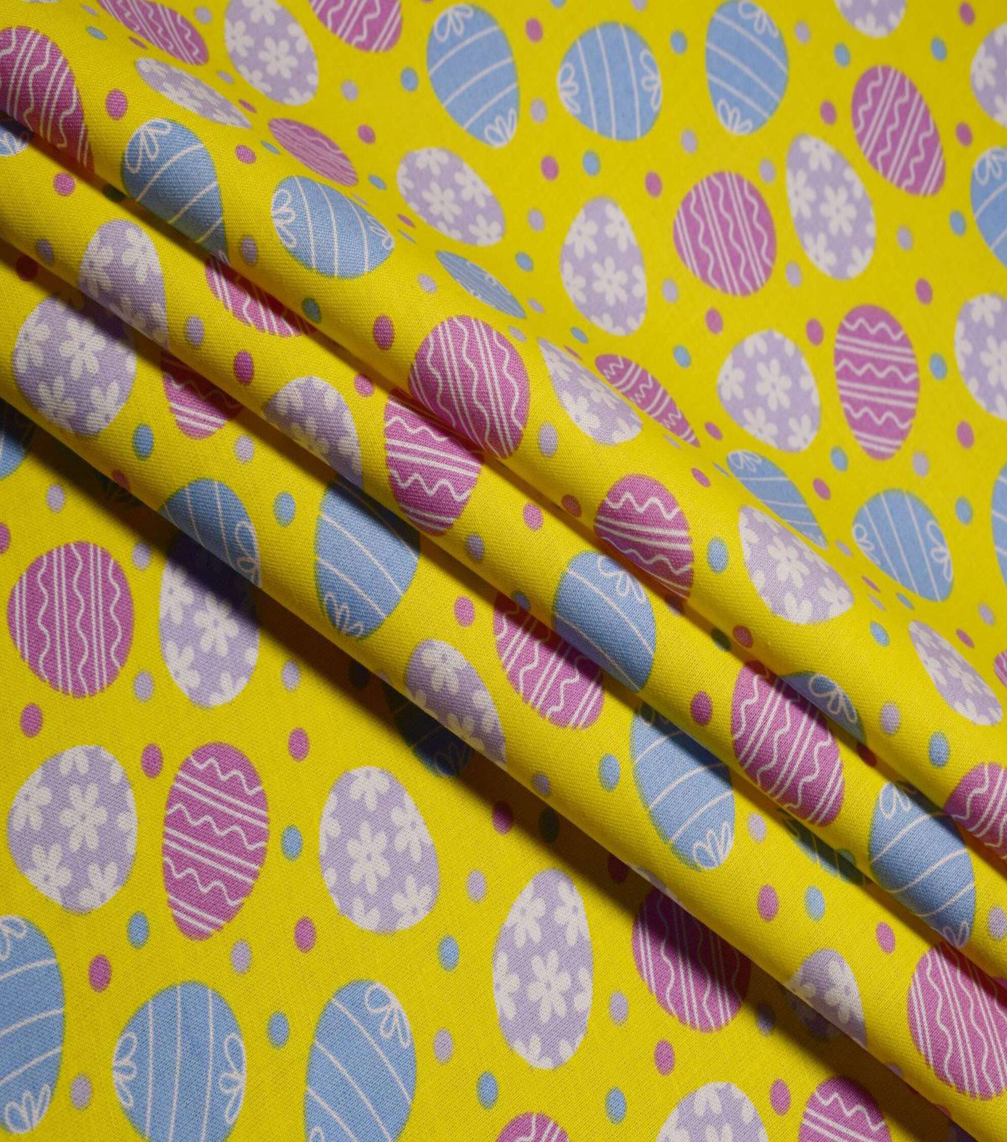 Decorate your home with our festive Patterned Eggs on Yellow Easter Cotton Fabric. This fabric is perfect for creating Easter-themed quilts, crafts, apparel, and home decor. The cheerful yellow background features colorful eggs in various patterns, making it a fun and playful addition to your Easter decorations.