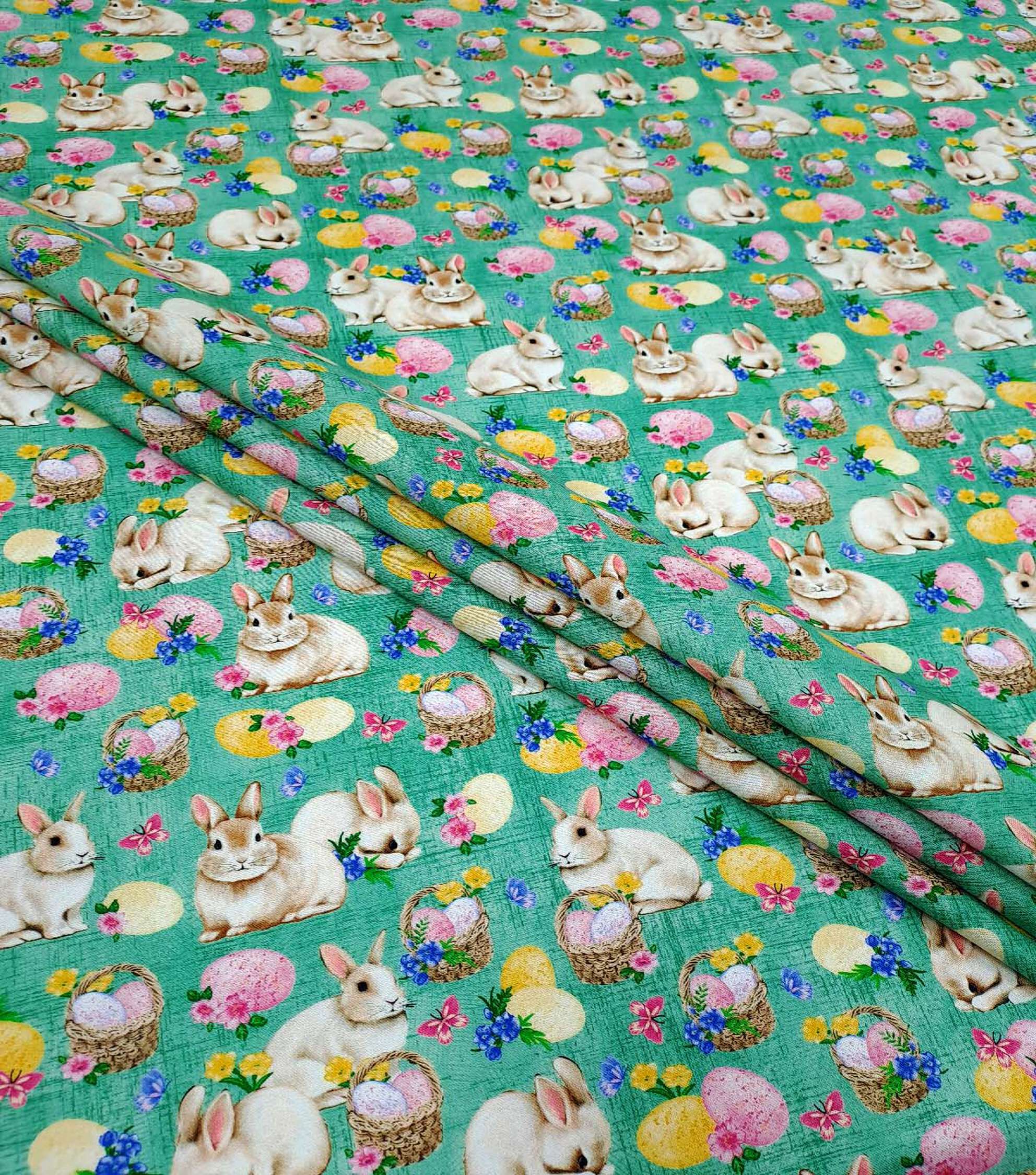 Bunny & Eggs on Sage Easter Cotton Fabric