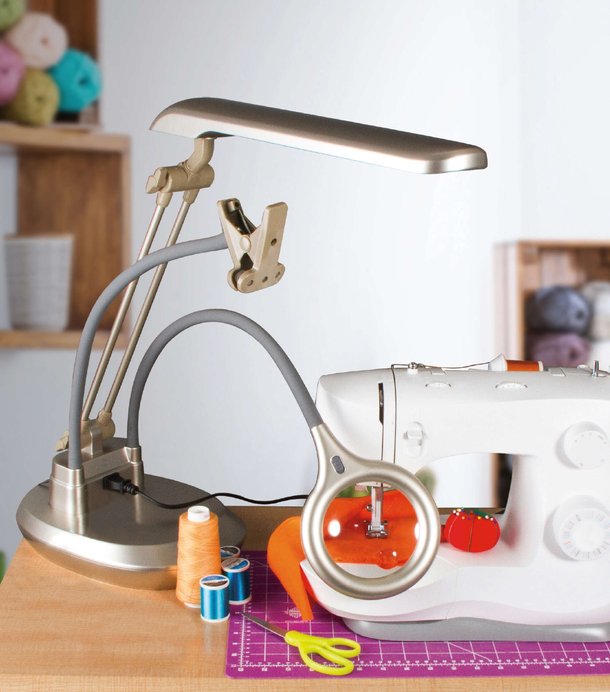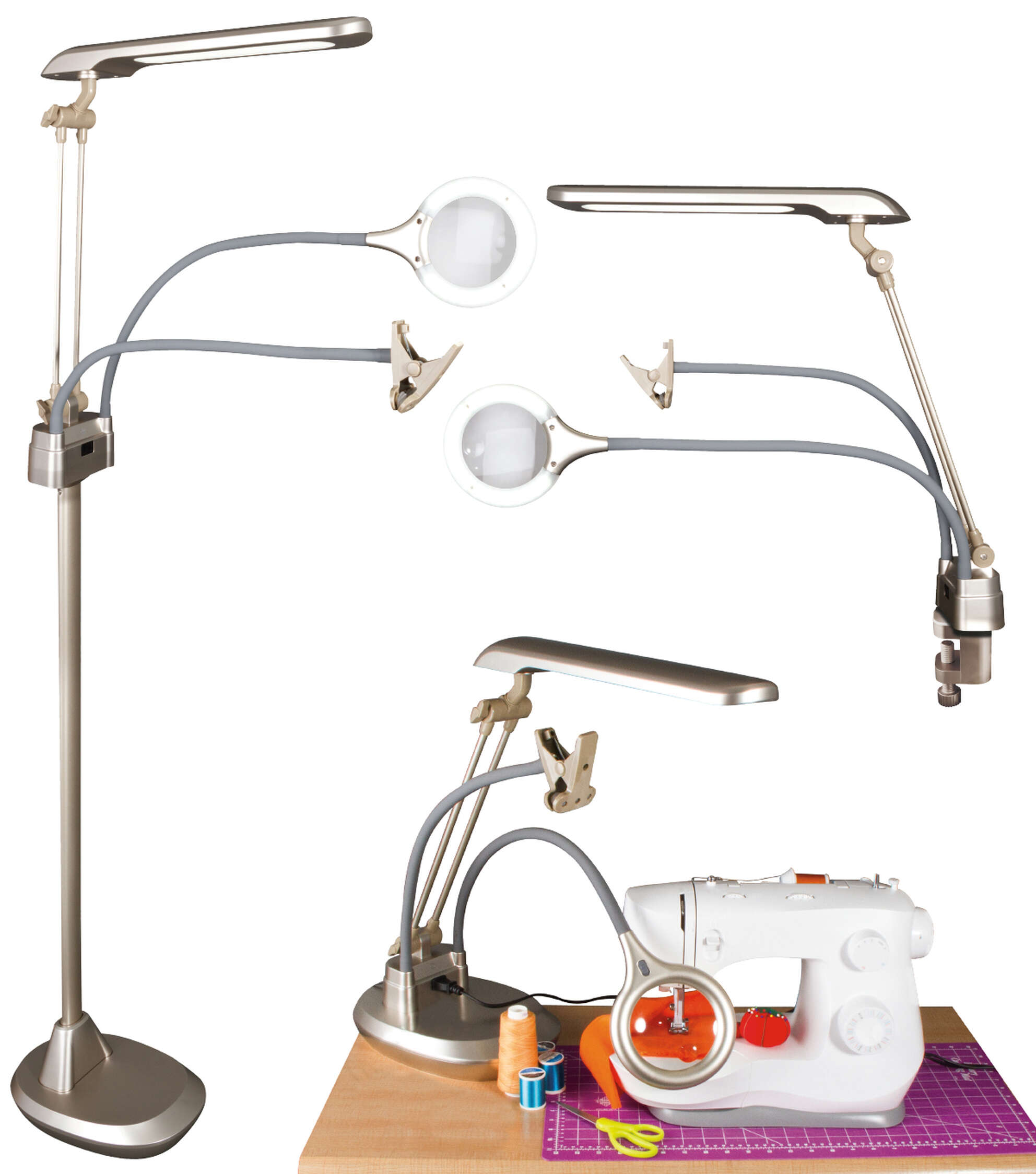 The most versatile and feature-packed lamp OttLite has ever developed, the OttLite Ultimate 3-in-1 Creative Station is a game changer for craft and sewing rooms alike. This lamp easily transforms from a floor lamp, to a table lamp, to a sturdy clamp-on lamp, so you can adapt it to your changing needs. Magnify the details with the 2x optical-grade magnifier that’s surrounded by 360 degrees of crisp, clear LED illumination. Both the magnifier and sturdy hands-free clip placed on long, flexible 20 ¾” arms so you can put them exactly where needed. There’s even a convenient outlet included to fully charge smartphones, tablets or power those craft tools. The long 18 inch x 3.5 inch shade features OttLite’s exclusive ClearSun LED technology – shown to reduce eyestrain and glare for hours of working in comfort. This high contrast, dimmable light has a color rendering index (CRI) of 95+ so you’ll see every color accurately and detail clearly.