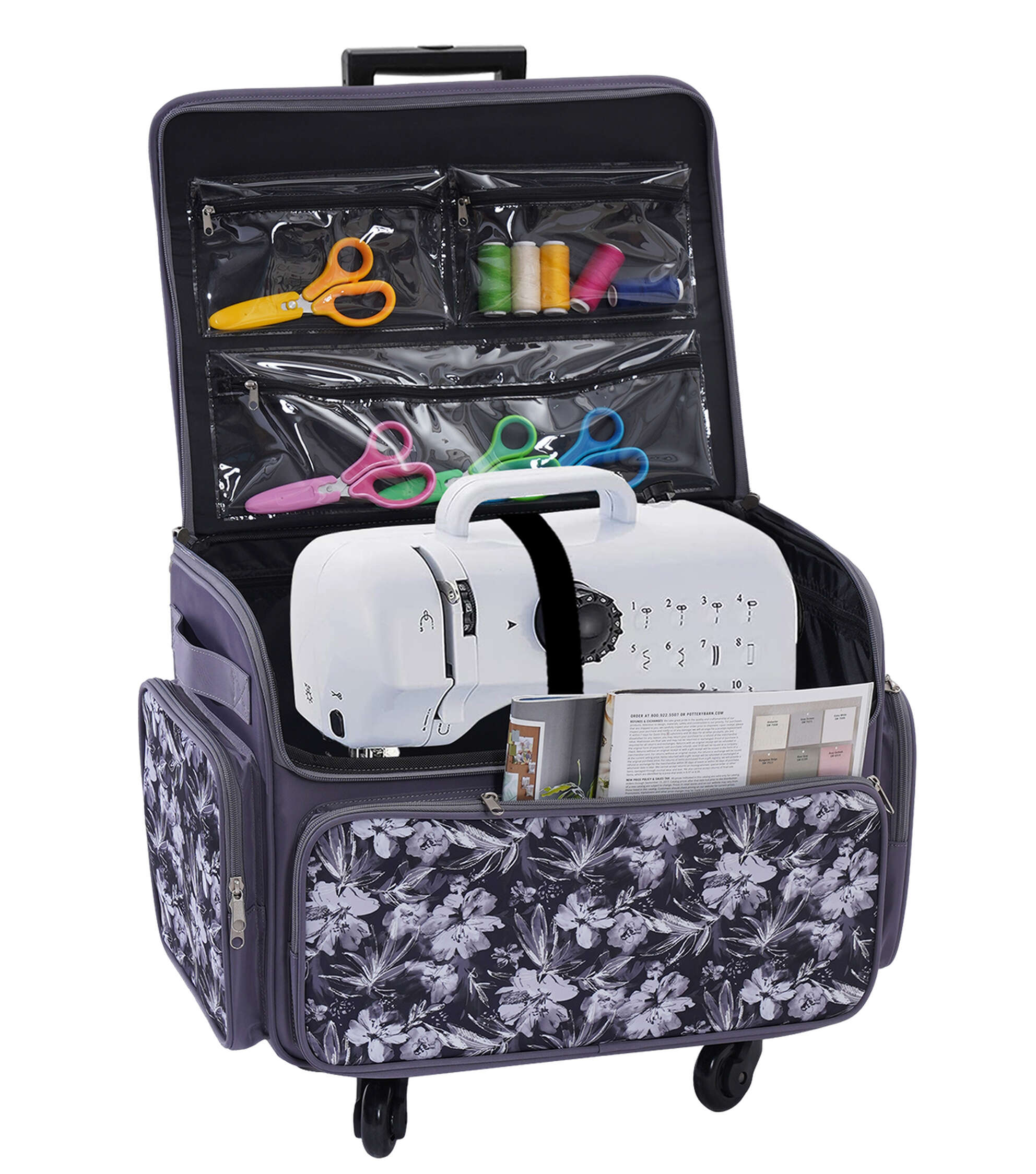 Stay Organized and Stylish with the 13" x 18" Purple & Black Floral Rolling Sewing Storage Tote by Top Notch