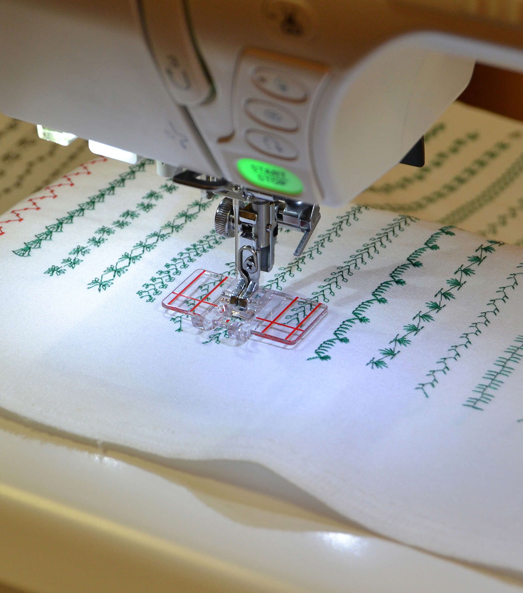 Having problems lining up or evenly spacing your border designs? Now the Border Guide Foot helps you to easily match up your border designs with the red lines of the foot. No need to mark every row beforehand! The secret to the border guide foot lies in the red guide marks. The two sets of vertical red lines are calibrated to allow perfect spacing of rows. The horizontal red line matches the needle drop so you can line up the start of each row. The small red mark denotes the center of the design for lining up with the marking for the first row.