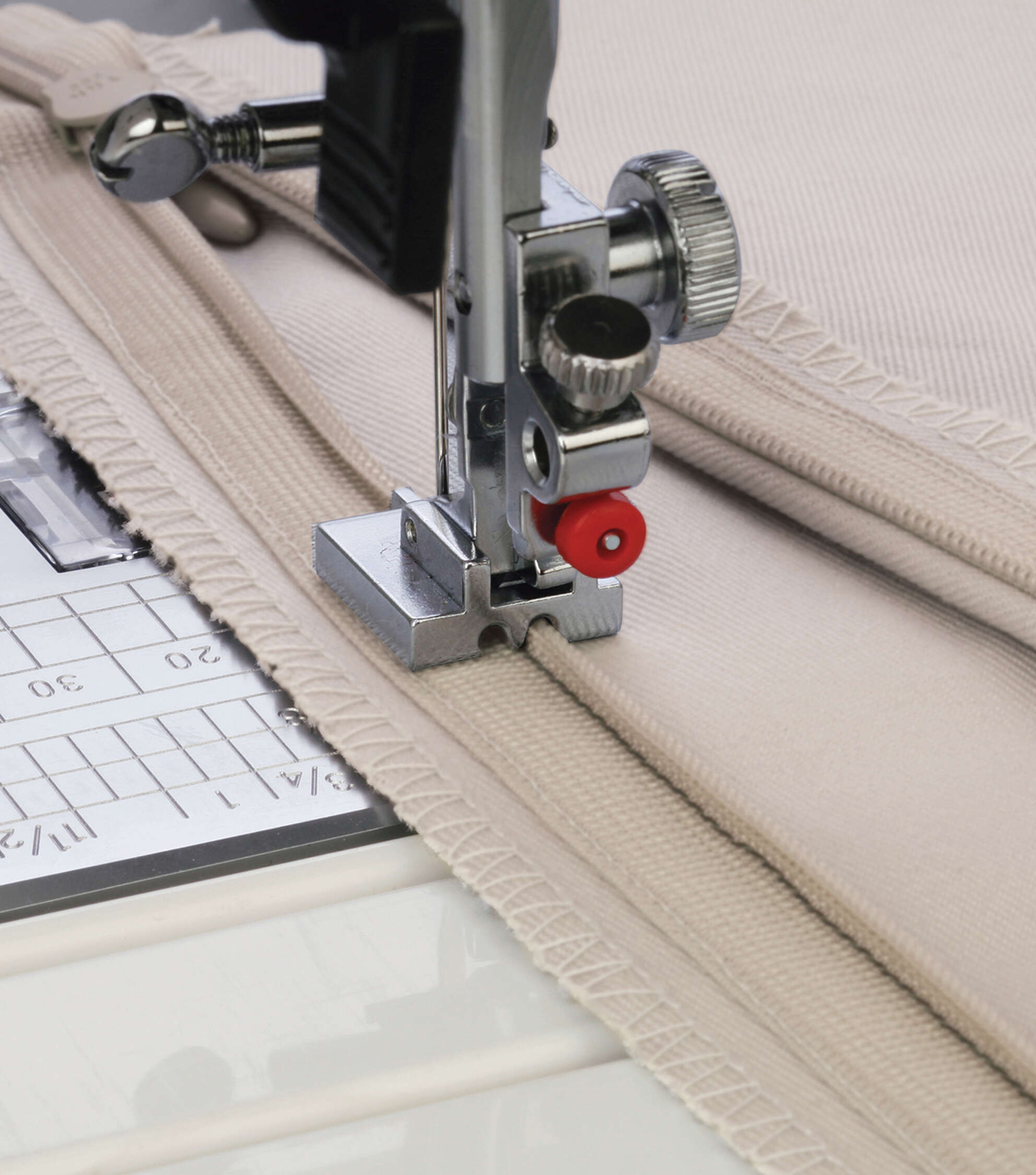 • Channels on both sides of the foot to accommodate both sides of the zipper.