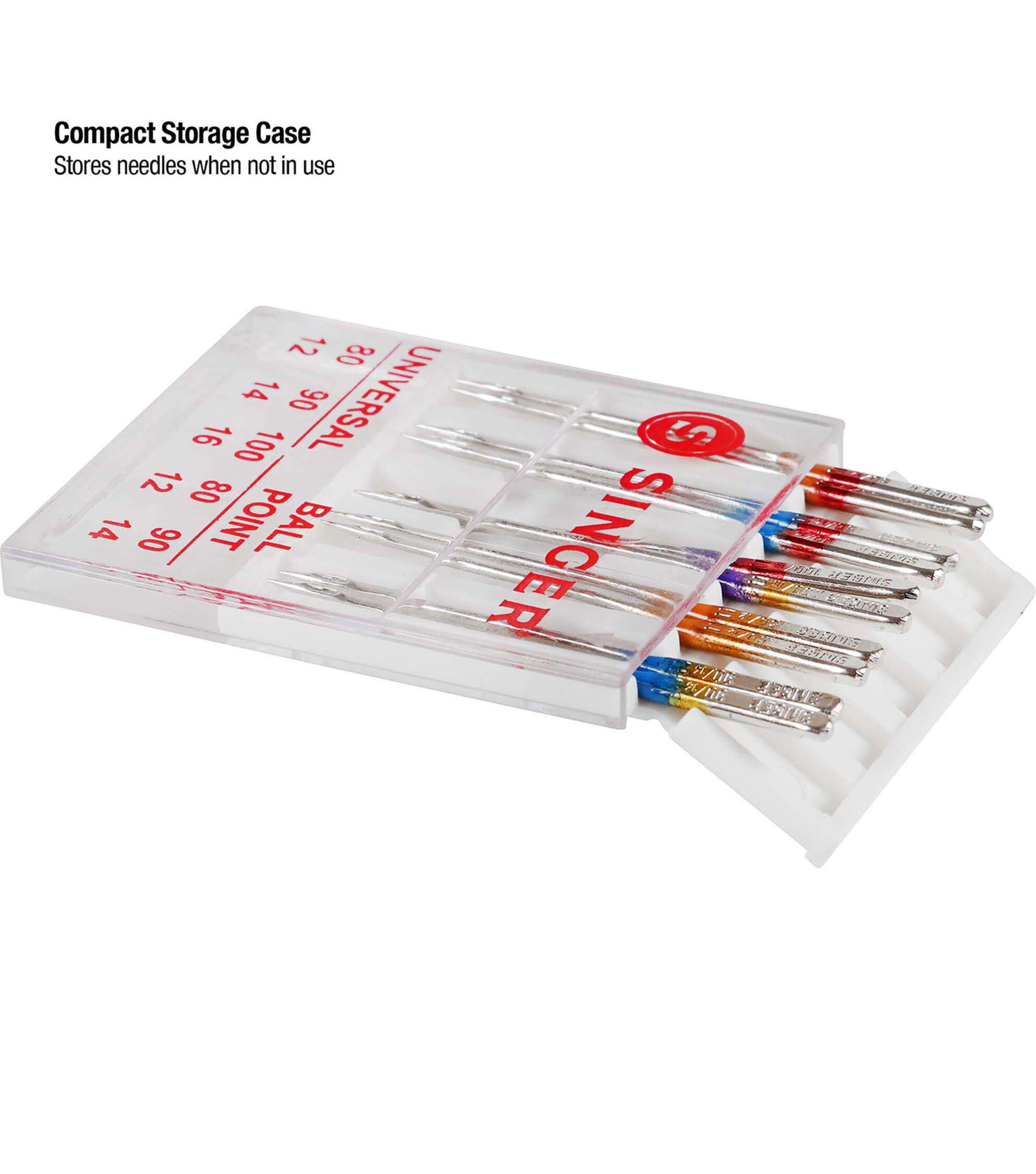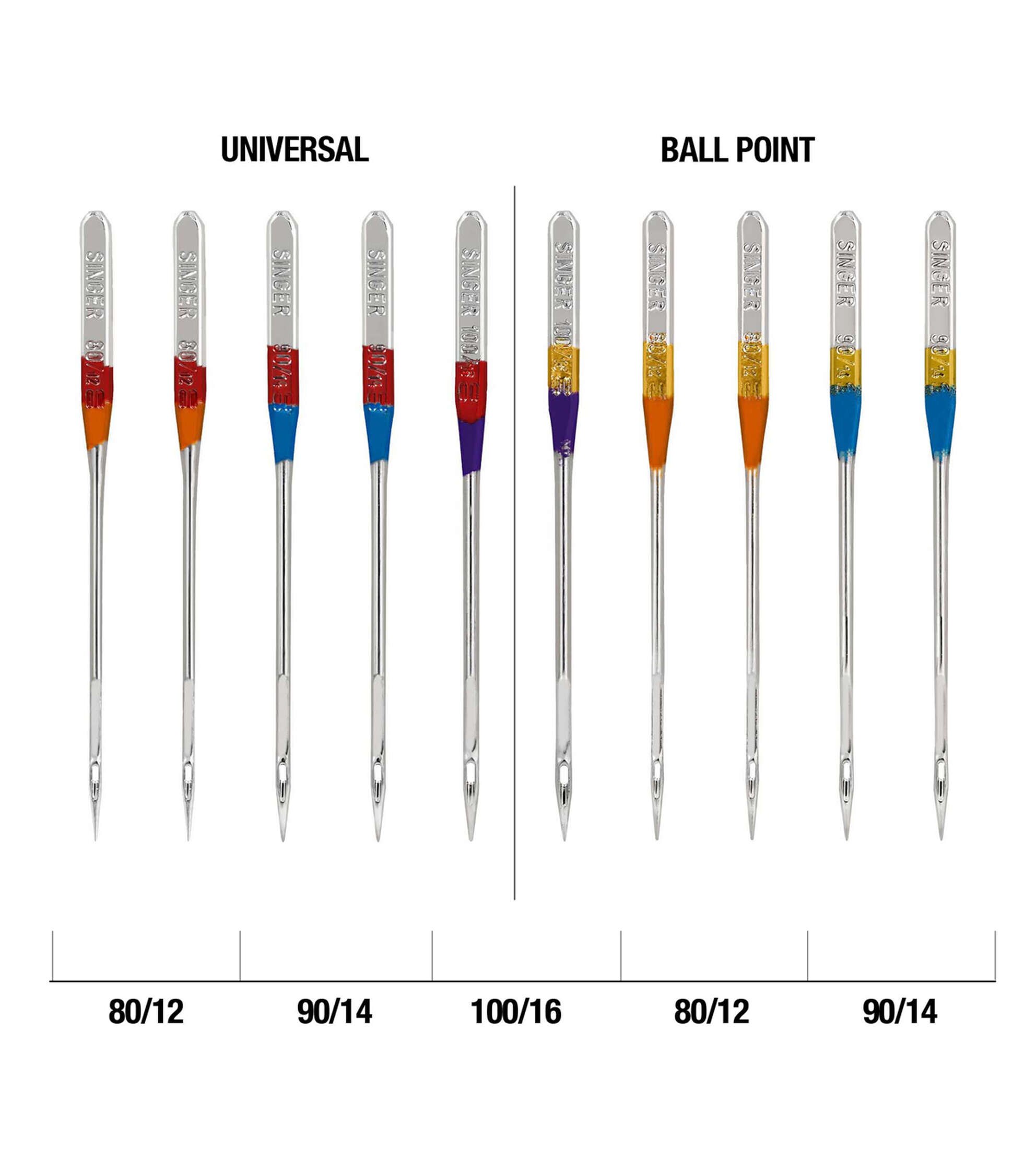 • The pack of 10 SINGER Regular and Ball point Sewing Machine Needles is a great starter kit offering the beginner sewing enthusiast two standard types of needles in varied sizes. Ball point needles are best used on knit fabrics, and regular point needles work best on woven fabrics. Machine needles are color coded to their sizes, which include: 2 orange size 80/12 to use on lightweight fabrics, 2 blue size 90/14 to use on medium weight fabrics, and 1 purple size 100/16 to use on heavyweight fabrics in both universal and ball point machine needles. The 10 machine needles come in a convenient plastic transparent case with individual storage slots and sizes marked on the clear cover. SINGER sewing machine needles can be used on SINGER, Brother, Kenmore, Bernina, Janome, Juki and other quality household domestic sewing machines. Dometic machines needles are not compatible with industry sewing machines.
