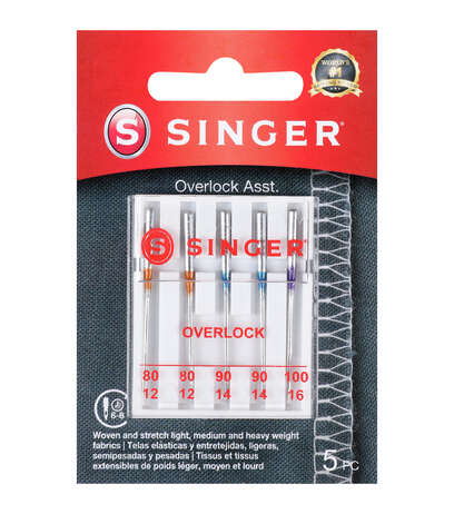 • SINGER Universal Regular Point Overlock Needles are 5 machine serger needles specifically used to sew over the edge of one or two pieces of cloth for edging, hemming or seaming, in serger machines. Use on SINGER overlock machines and other quality sewing machines that require a BLx2 or JLx1 needle. Color-coded needles help make choosing the proper needle and size easy. Needles are flat shank for ease of insertion and double grooved for high quality sewing performance. These serger needles are only for use on SINGER, ProFinish, Professional and other brand serger sewing machines that require 2022 needles