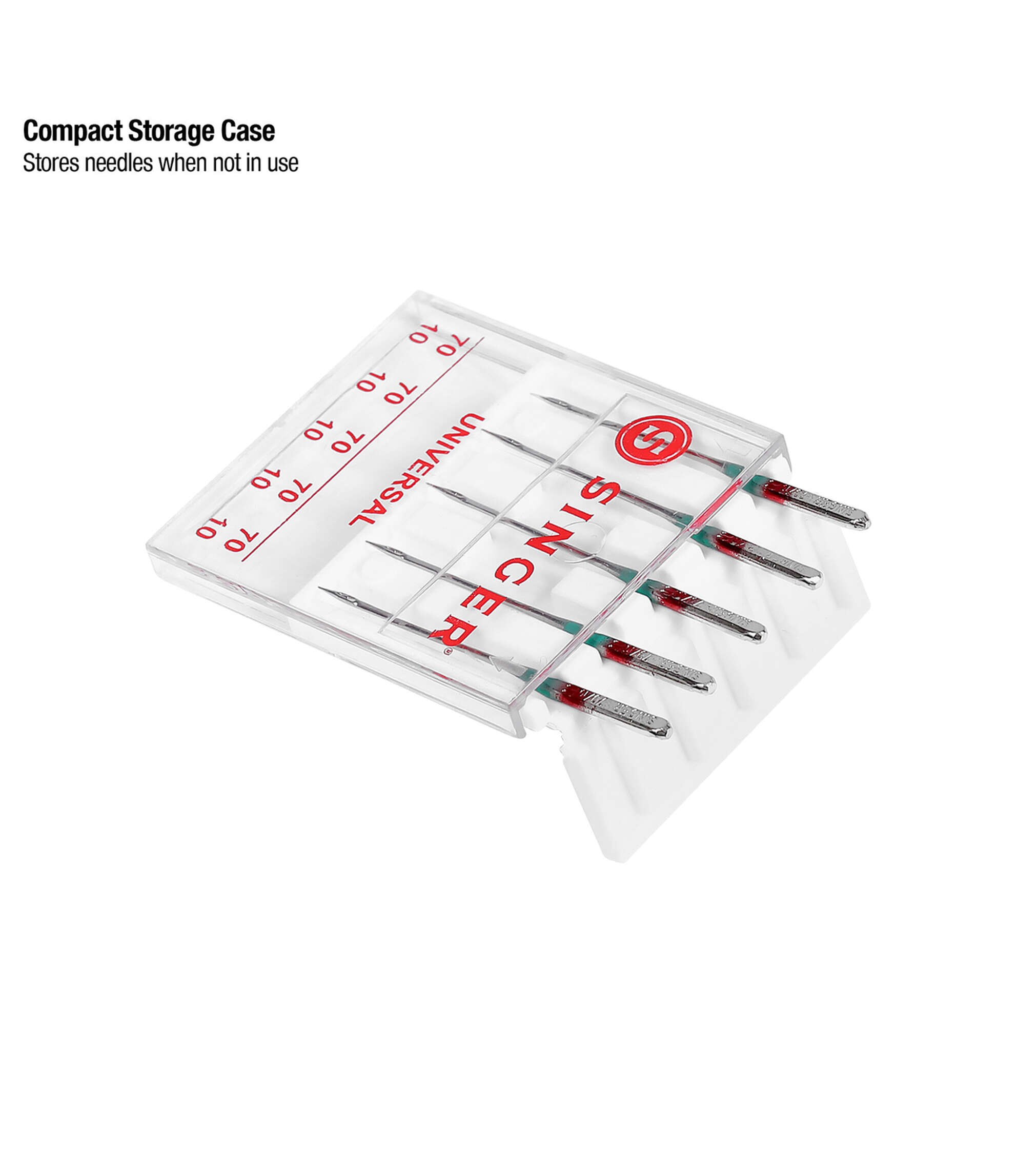 • To prevent dull needles when not in use, store needles in the compact transparent case, which includes size marking on its cover