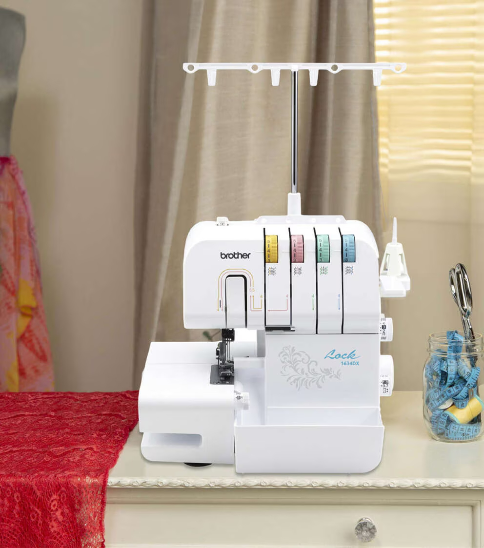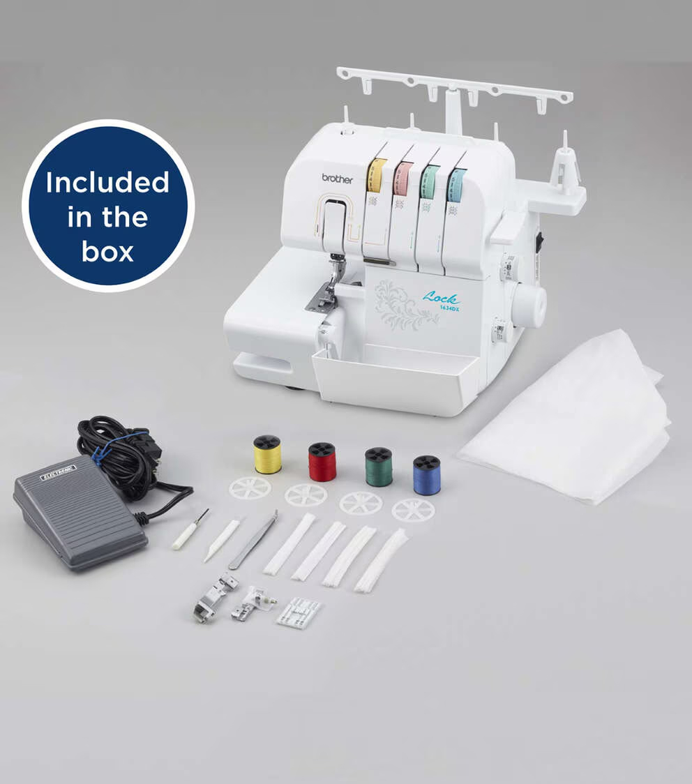 The Brother 1634DX Serger makes it easy to create a professional finish touch to your home décor and creative fashion sewing. Expand your creative options with the 1634DX and easily finish edges and hems on a wide range of fabrics. This serger allows you easily create ruffles, decorative edges, and gathers, and use decorative threads for custom details. This serger works with either 3 or 4 threads, for added flexibility. Get professional speed, with the ability to sew up to 1,300 stitches per minute. Includes 3 serger feet, 4 mini spools of serger thread, a brightly lit LED work area, soft protective machine cover, and an English/Spanish Operational Manual.
