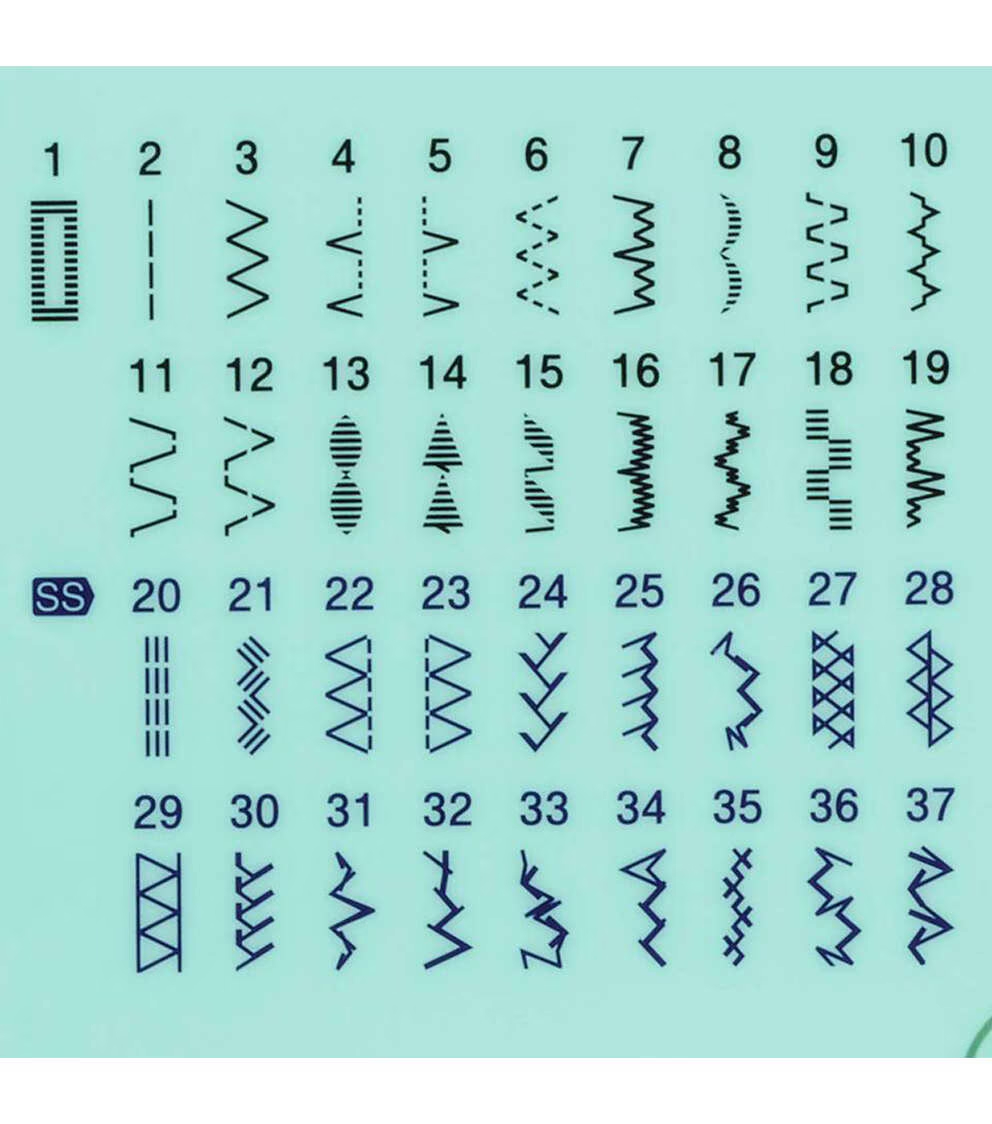 37 built-in stitches include utility, decorative, blind hem, zigzag, and stretch stitches and an auto-size buttonhole