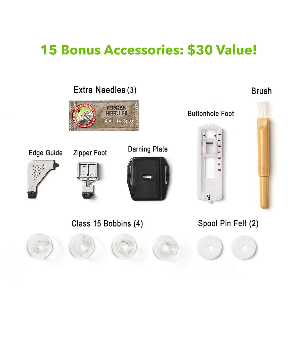 - Complimentary 3 Months of Digital Craft & Sewing Classes 15 bonus Accessories - a $30 Value! Includes: All-Purpose Sewing Foot, Zipper Foot, Buttonhole Foot, Darning Plate, Machine Needles (3), Class 15 Bobbins (4), Seam Ripper & Brush, Spool Pin Felt (2), L-Screwdriver