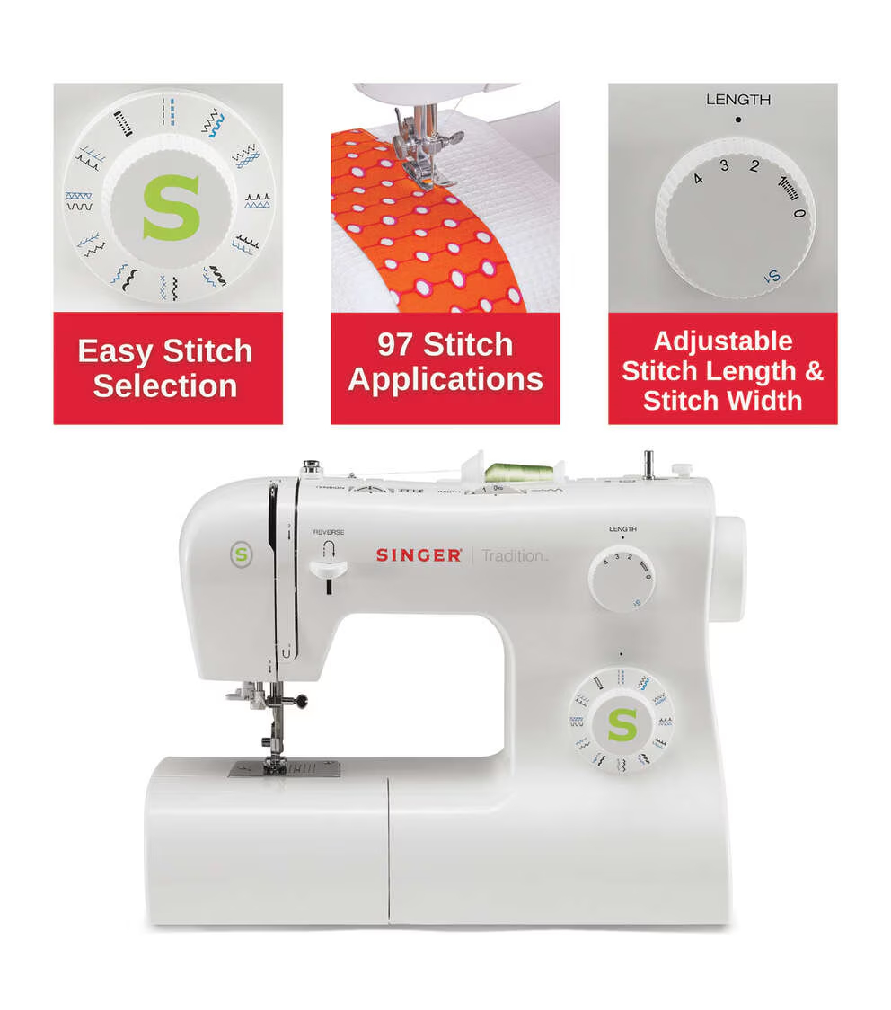 From mending and everyday sewing to crafts and simple home decor, the SINGER Tradition 2277 is the perfect sewing machine for a busy and creative sewist on-the-go. With almost one hundred Stitch Applications, you can easily customize projects with basic, decorative, and stretch stitches. The adjustable stitch length and width functions offer further stitch customization. Plus, you can create buttonholes in one easy step!The Tradition 2277 sewing machine also includes four accessory feet to ensure a great start on your sewing journey! One of the included presser feet is the SINGER Button Sewing Foot which makes sewing on a button a breeze! SINGER includes everything you need to make your sewing easy and fun. The Tradition 2277 sewing machine offers many other ease-of-use features like the super simple built-in Needle Threader, removable free arm for smaller projects, and easy stitch selection. Whether you want to sew a dress, stitch a pillow, or create a tote, you will see how the Tradition 2277 sewing machine was designed with you and your projects in mind!