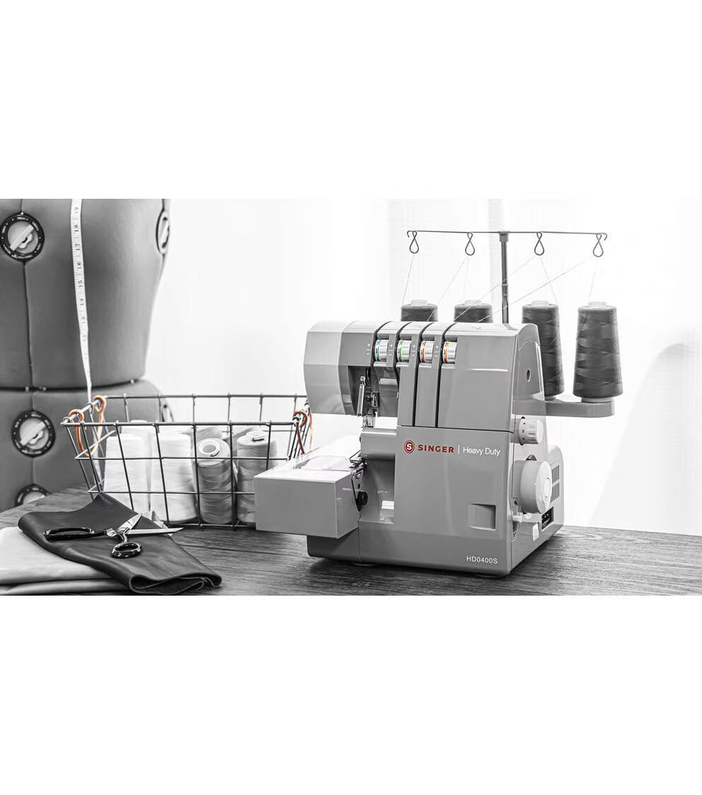 The SINGER HD0400S Serger saves you time because it sews a seam and seam finish at the same time while trimming away any excess seam allowance. This Serger features a heavy duty metal frame, a stainless steel bedplate, 60% larger cutting knife, 2/3/4 thread capacity, free arm, differential feed, 1300 stitches-per-minute (SPM), adjustable thread tension, built-in rolled hem plate, pre-threaded color coded spools, extra high presser foot lift, 2 LED lights, quick and easy threading, and includes an All Purpose Presser Foot.