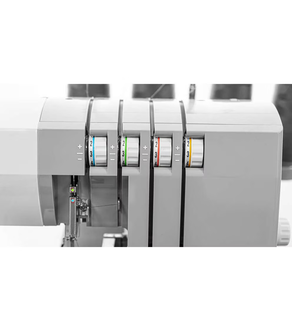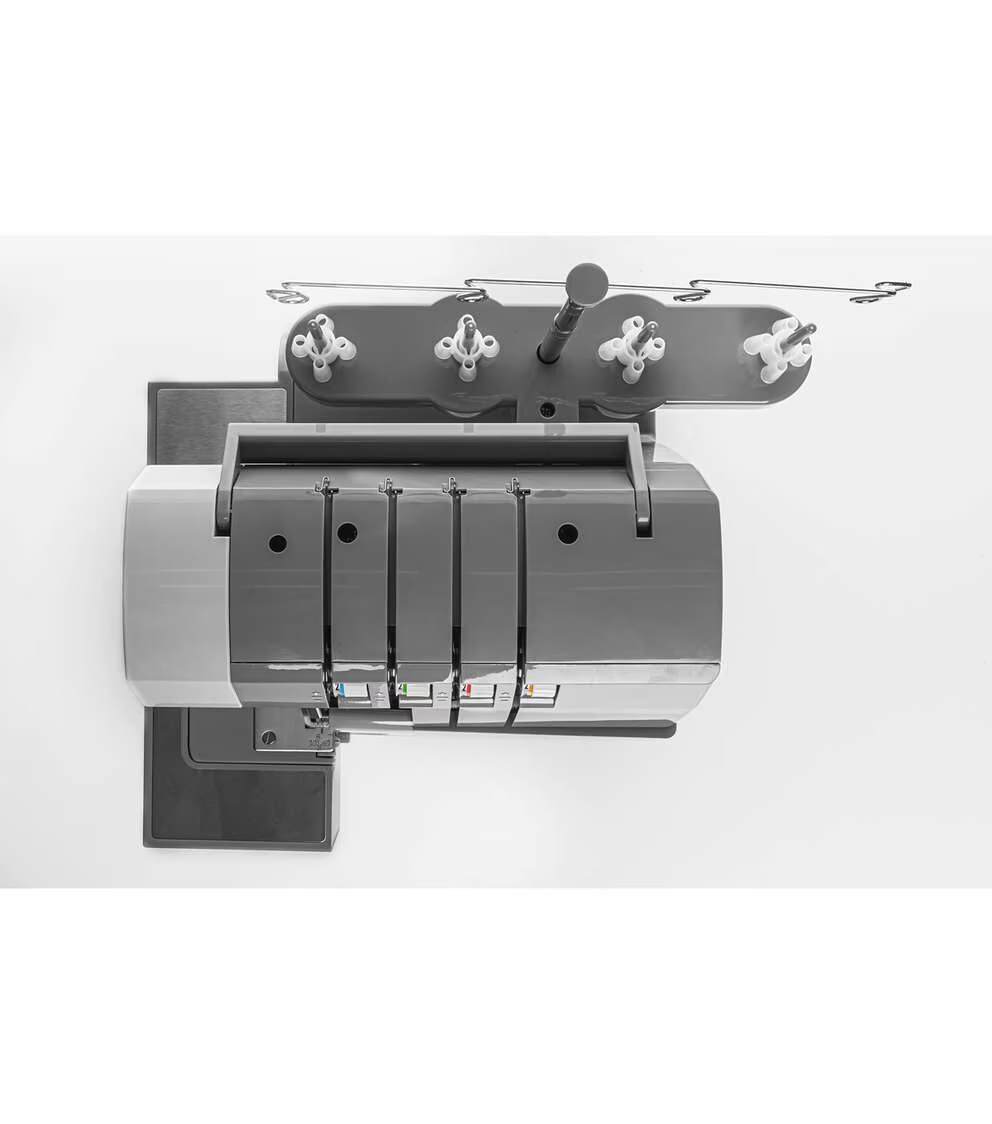 The upper knife can be engaged to trim excess seam allowance as you sew, or it can be rolled out of the way for special techniques like flatlocking.