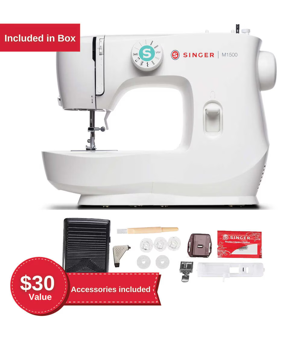 The SINGER M1500 sewing machine is lightweight and portable, making this one a great choice for taking to sewing class or for sewing in smaller spaces. The SINGER M1500 includes 57 Stitch Applications from zig zags to a blind hem, providing you the essential stitches for your sewing and mending projects. Thanks to the preset stitch length and width, even beginners will find this machine easy to use. Sew fashions, piece quilts, create crafts or do simple mending – you can do it all!