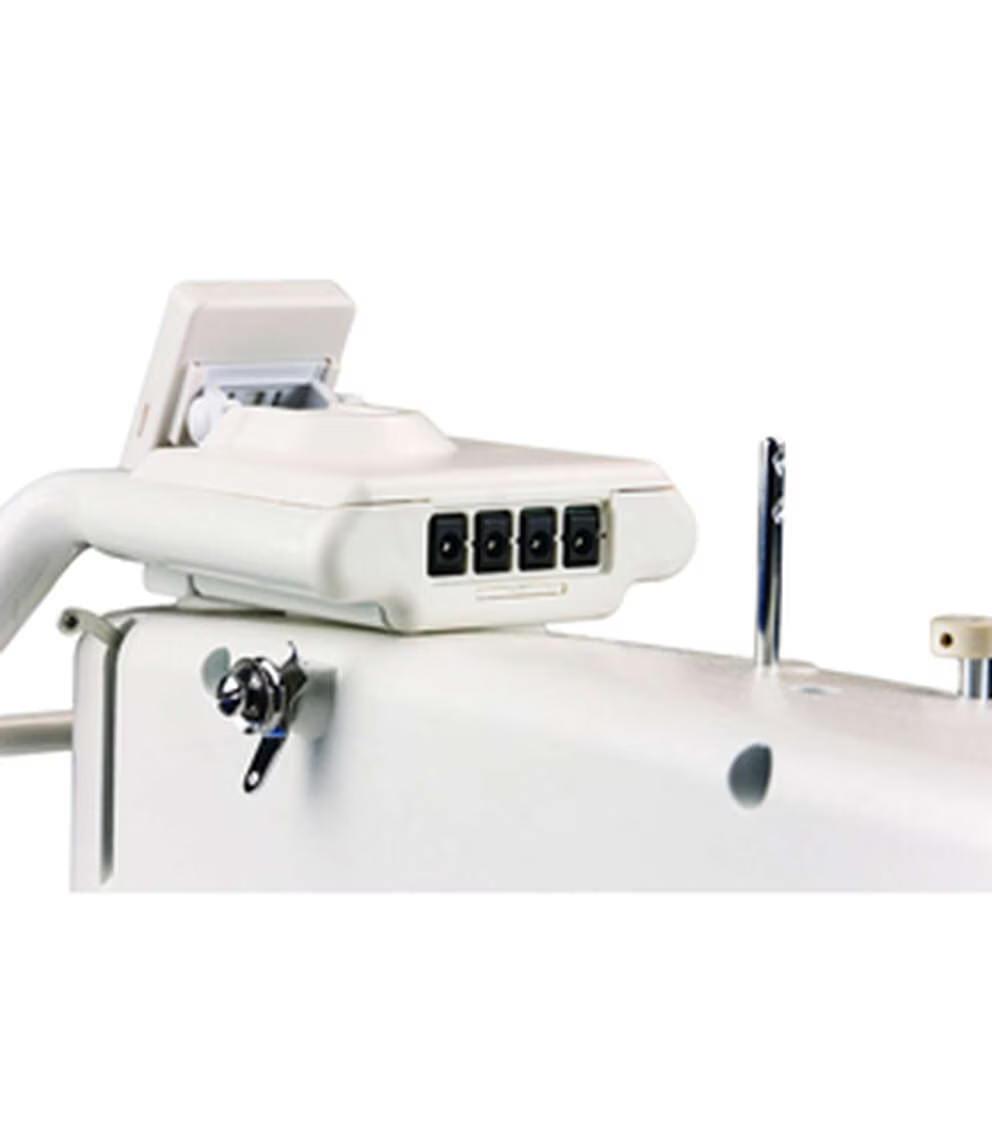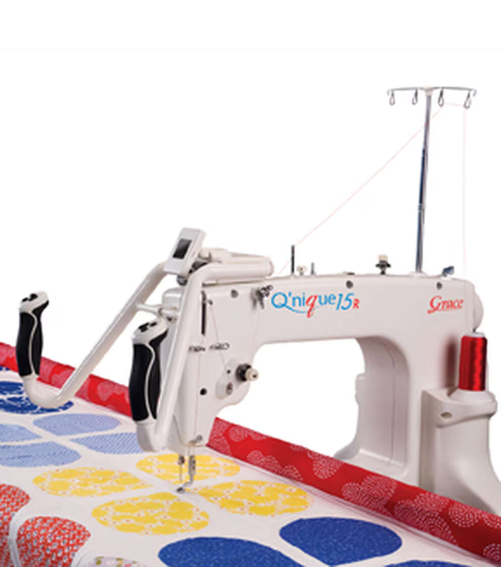Get all the high-end quilting features packed into The Grace Company Q'nique 15R Mid-arm Quilting Machine & Frame. This quilting machine and frame offers superior stitching quality. The stitch regulation keeps your beautiful stitches consistently the same length. As you speed up or slow down in your movements, the machine will speed up and slow down its stitching speed. You don’t have to worry about some stitches being longer or shorter than others. This machine features six quick-access handle buttons, a full-color OLED screen, built-in bobbin winder, an easy-access bobbin and a large M-class bobbin. The Q-Zone Queen Frame sets up in queen or crib size. It is a no-baste two-rail system designed to make your quilting projects easier and more convenient. The frame features a smooth gliding track system for easy and precise machine movements. It also has height-adjustable legs, and includes quilt clips for easy fabric loading and tension control. New quilters are delighted to find how much easier quilting is with this quilting frame. Moving the machine to stitch is like drawing with a pencil on paper, not moving the paper underneath a stationary pencil.