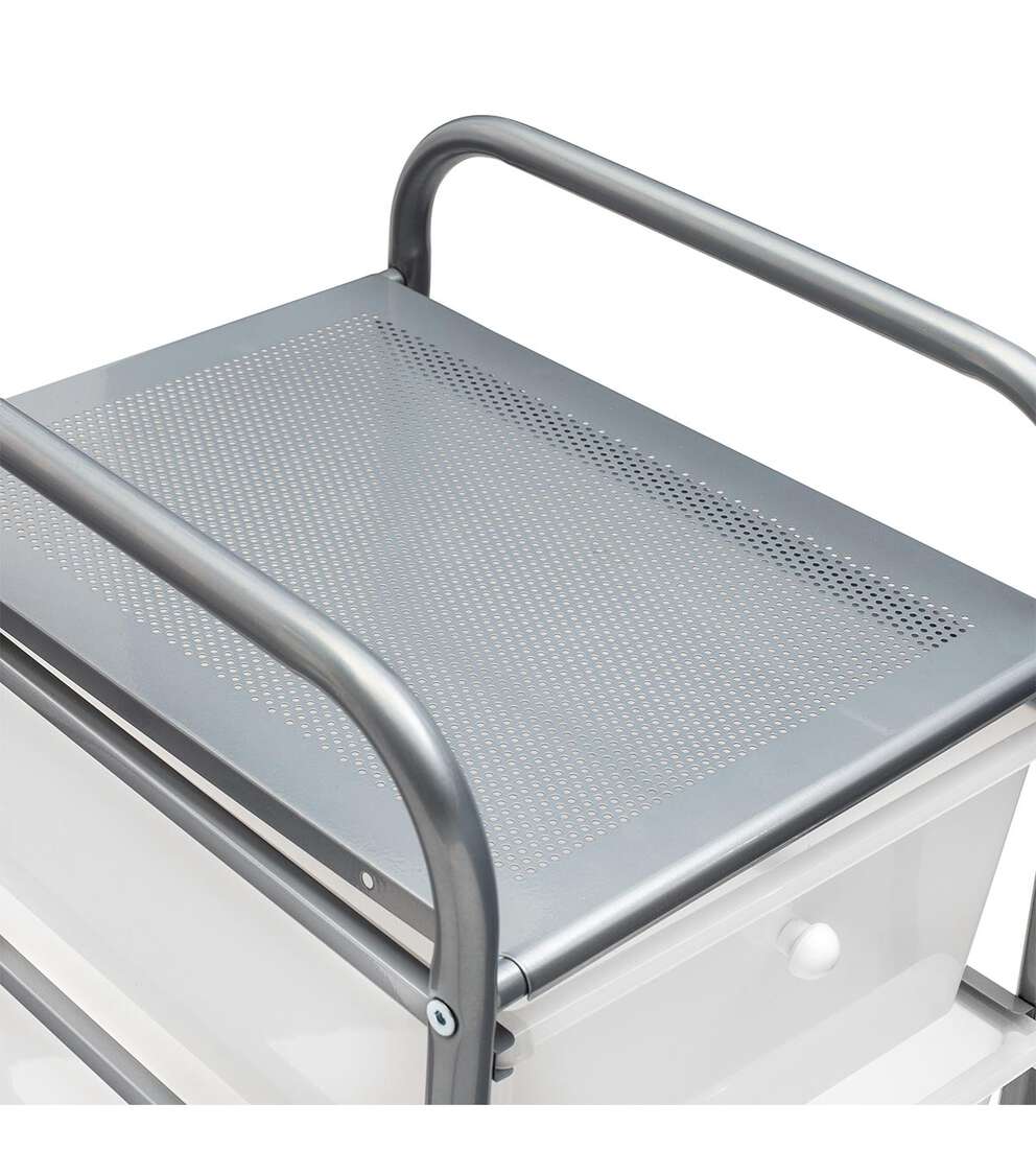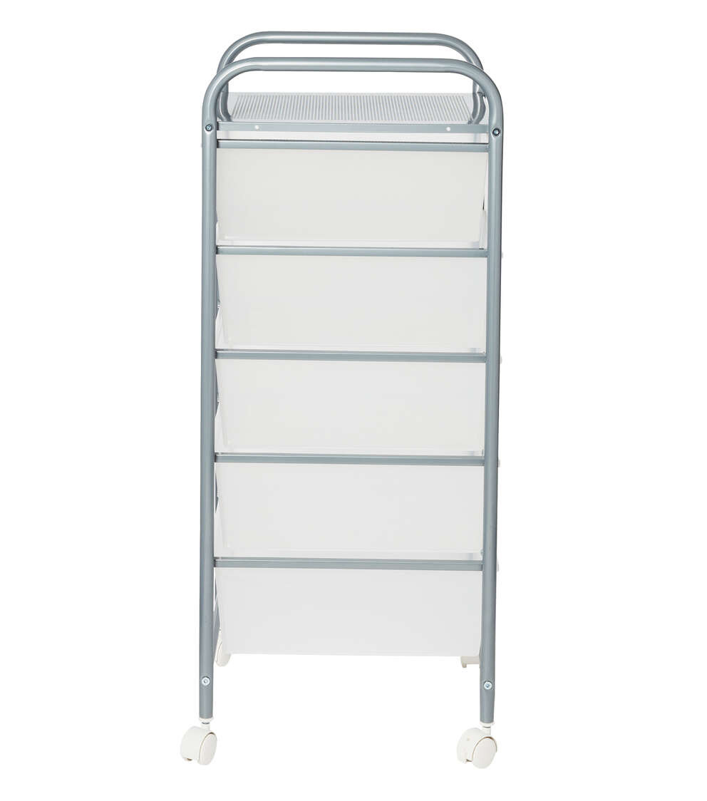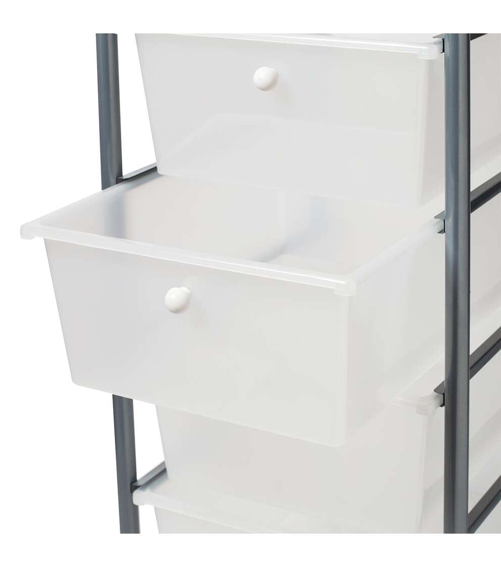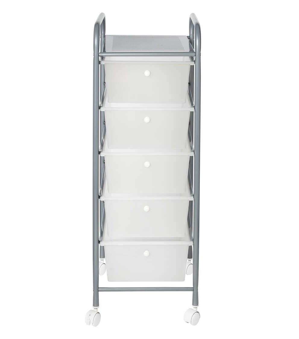 It can be challenging to keep a craft area organized while your creative juices are flowing and you are surrounded by endless supplies. This 5-drawer craft cart brings it all home with spacious drawers for convenient storage and a tabletop work space for your project or to store larger items on. Wheels keep the cart on the move with you, and they also lock for stability. So whether you're a beginner or an aficionado, this cart is the perfect crafting companion.The ideal storage solution for all your arts & crafts.Clear plastic drawers provide easy access to supplies.Tabletop surface for extra work space or cricket .Locking wheels for extra stability while crafting.Dimensions: 14"W x 37"H x 15"D.CRTN09175