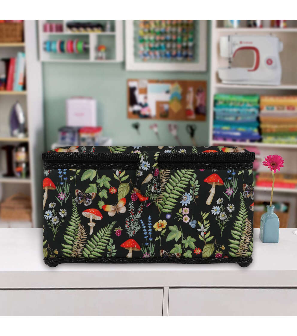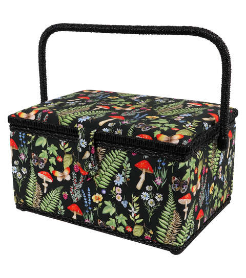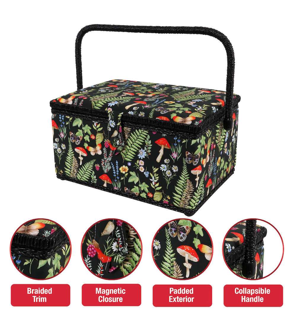 The SINGER Large Sewing Basket in a Woodland Nature Print measures 12.75” wide by 9” deep and 6.5” high. This sewing basket is large enough for storing sewing needles, thread, bobbins, and an assortment of sewing accessories and tools. This storage basket is covered in a high-quality, wrinkle-free fabric in a black, green, red and blue woodland print with a decorative, black trim. Its sturdy frame and matching collapsible handle make the sewing kit easy to store and an ideal travel case to carry your essentials for sewing projects on the go. The storage box has a magnetic button closure to keep contents secure, and it contains a removable hard tray insert that offers extra storage space and keeps your sewing supplies neat and organized. This versatile storage basket also doubles as a stylish storage container for crafting tools, scrapbooking supplies, colored beads, art supplies, costume jewelry, or beauty products. This is the perfect sewing basket for easy travel, ample storage, and optimal organization.