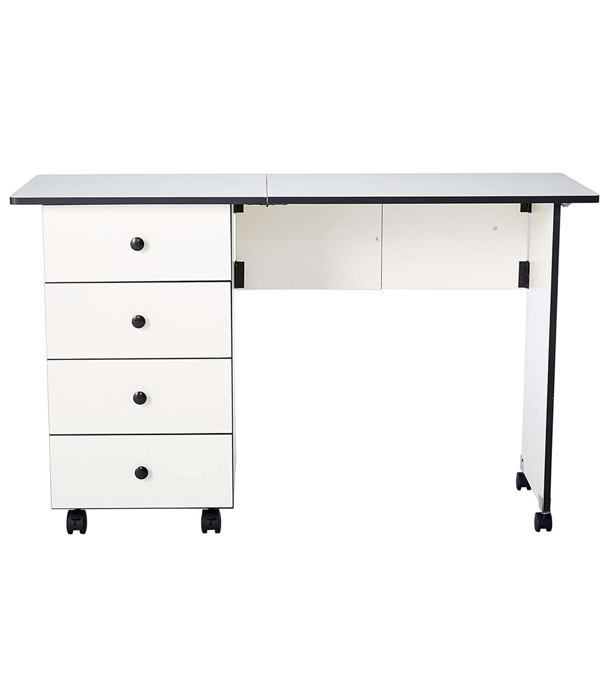 - Includes a sewing table features four drawers for supply storage and locking casters for easy mobility